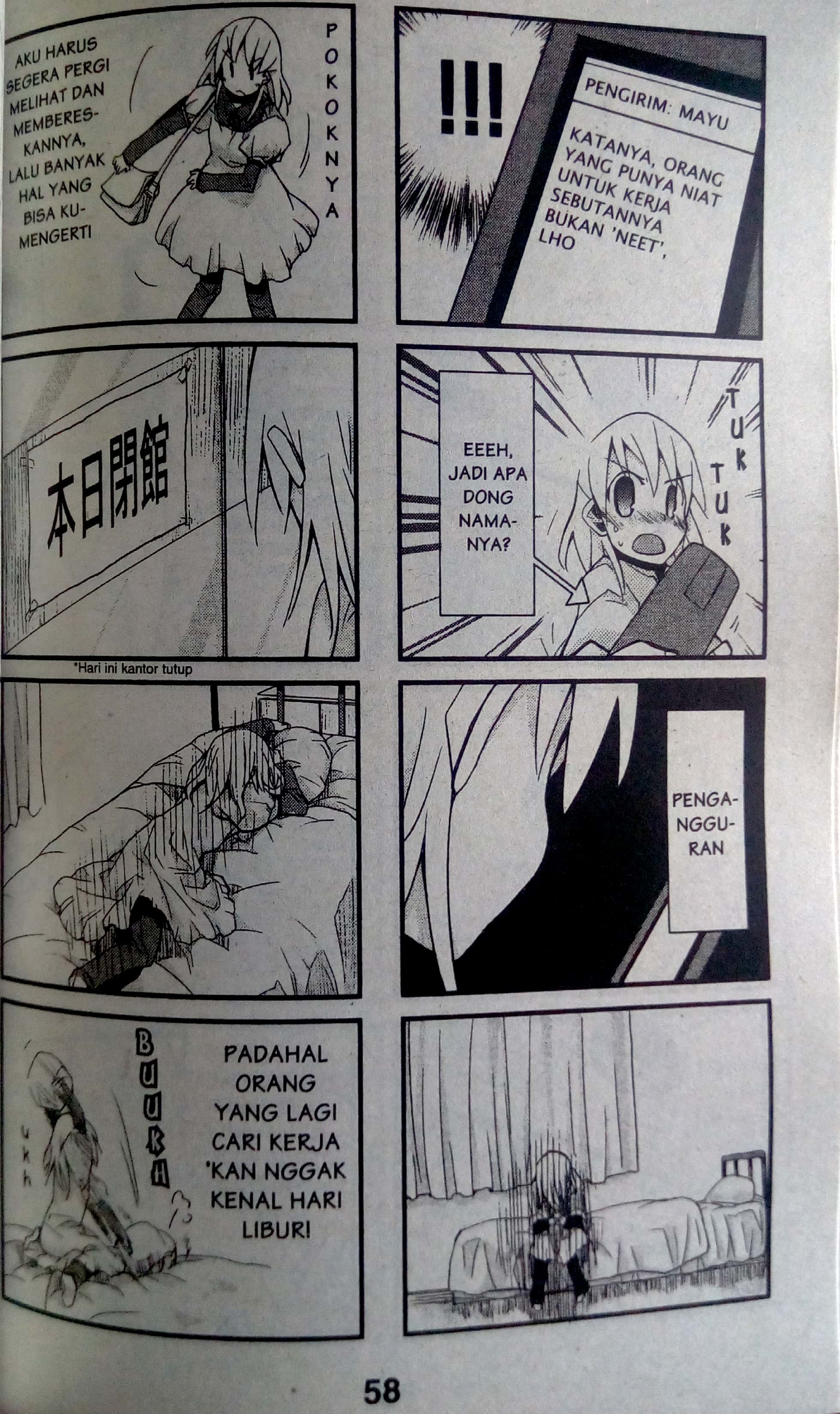 The comic mainly tells the story of Kanae, who has just graduated from high school. She didn’t continue her studies to a university and she hasn’t started to work in a company either, thus she describes herself as a NEET. The 4-panel comic goes on with Kanae’s daily life as a NEET and her struggle to get a job, while some of her friends—who already have works—also appear.