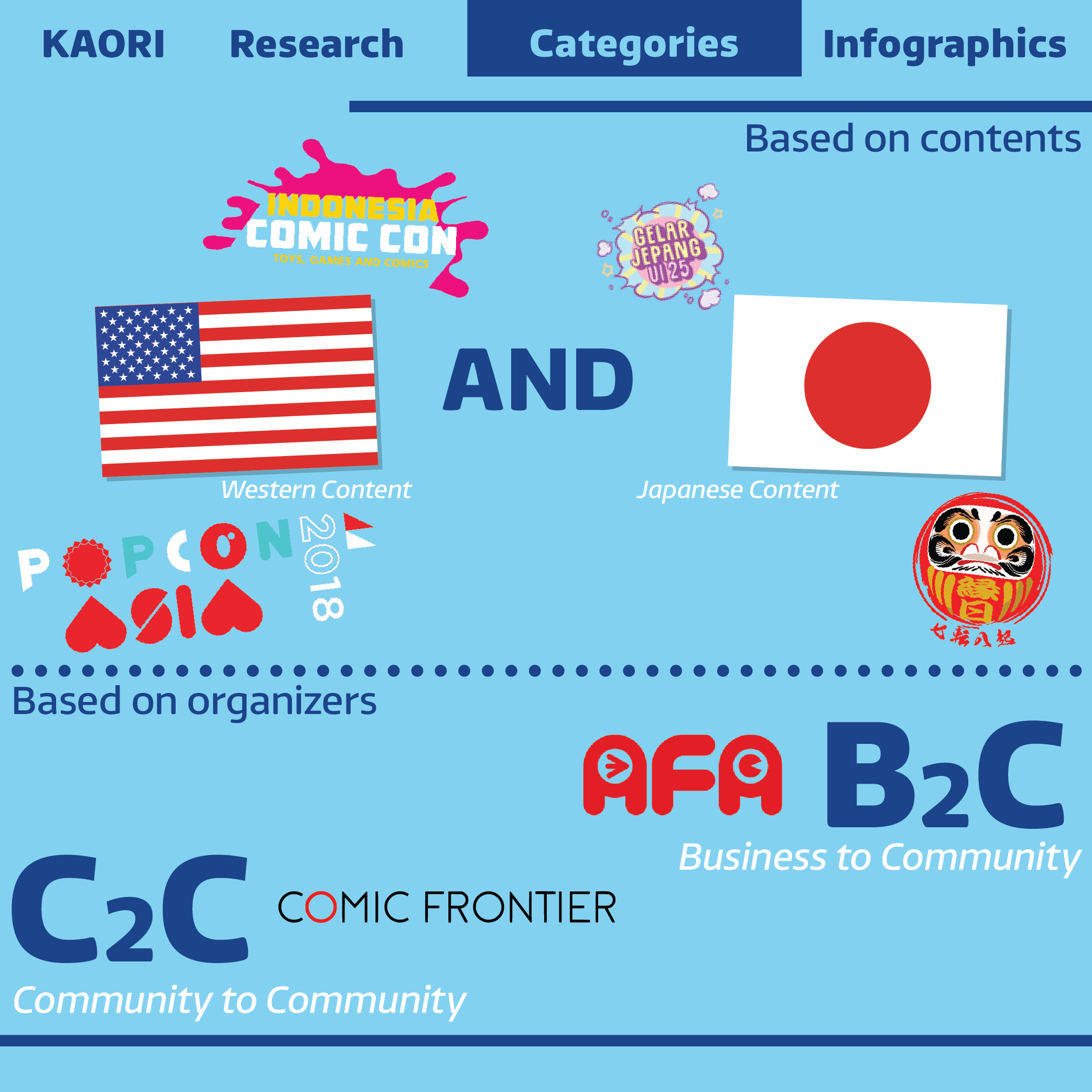My research on the other hand, groups events based on the types of contents featured by the events. First, there are events that largely feature Japanese popular culture such as anime, manga, games, cosplay, doujinshi, and the like. These events include Anime Festival Asia (business-to-community) and Comic Frontier (community-to-community), among others. Next, there are events that feature Japanese culture in general, which includes traditional culture. Some well known events of this kind in the Greater Jakarta area include the Ennichisai of Little Tokyo, Blok M in South Jakarta, and campus festivals held by Japanese major students or Japanese clubs such as Gelar Jepang held annually at Universitas Indonesia in Depok. Then, there are events that feature popular culture in general, which can include “Western” contents and contents from Indonesian creators. Among these events are PopCon Asia and Indonesia Comic Con (both are more business-to-community events).