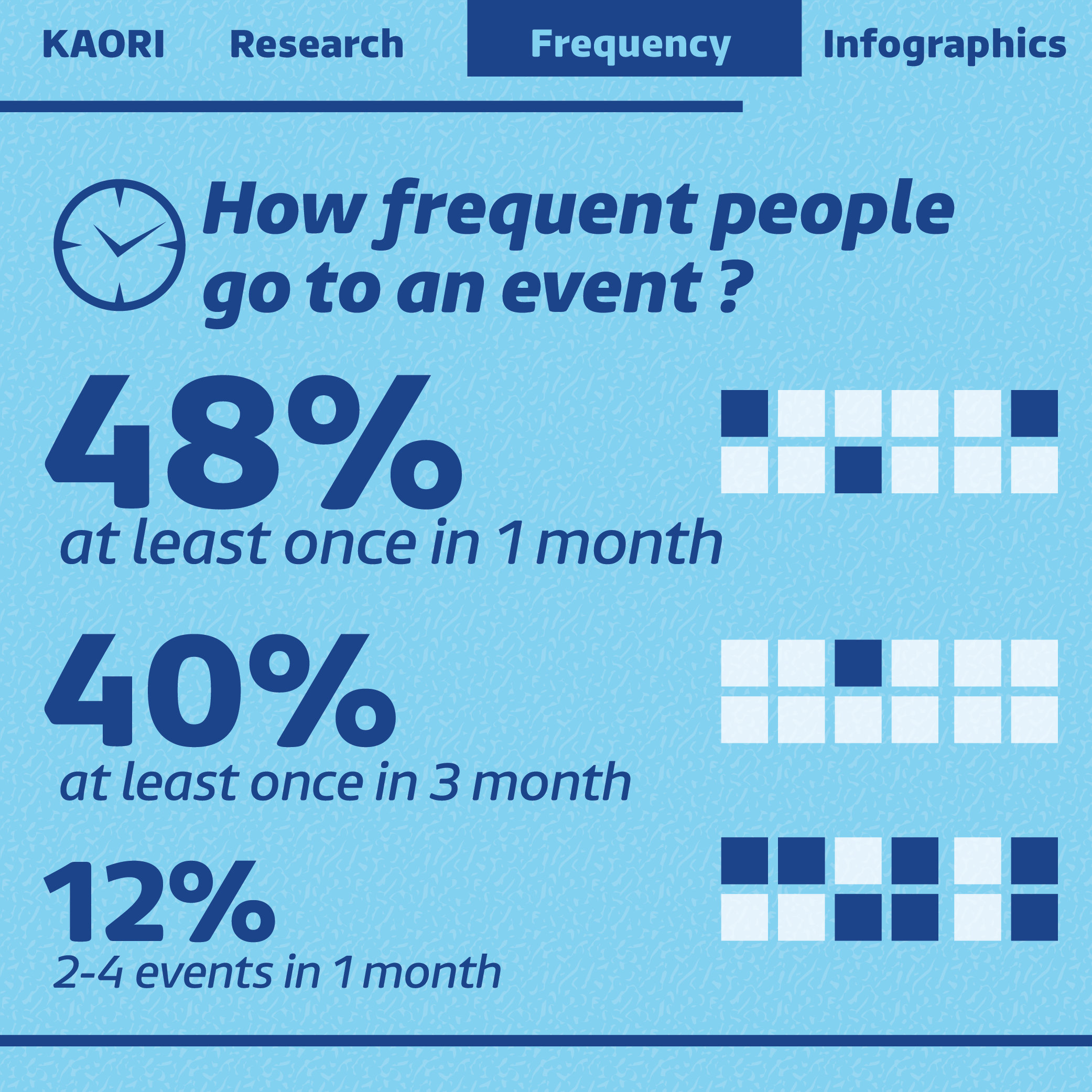 With so many events may be held within a year, people can go to events quite frequently. In my research, 48% of the respondents reported to go to events at least once in a month. 40% others at least once in three months, while 12% may attend 2-4 events in a month. With a variety of events at different places to choose from, how do people determine which events to attend?