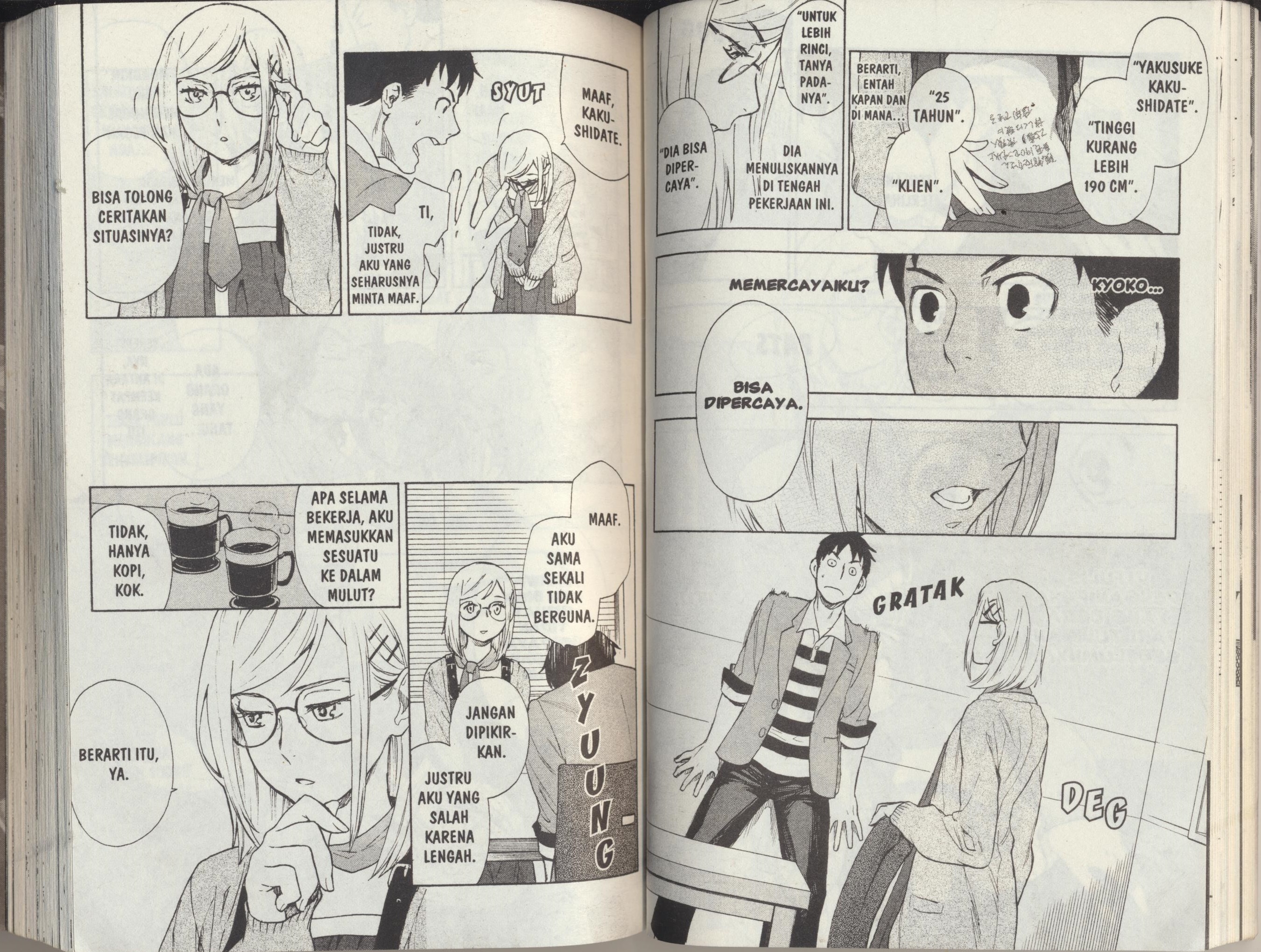 Although Kyoko Okitegami is the main detective of this manga, the story itself is mainly told from the perspective of Yakusuke Kakushidate, an unfortunate young man who is often involved as a suspect in mysterious cases. In those cases, Yakusuke (who can be considered as “Watson” in this story), always seek the help of Kyoko, a detective who he is romantically interested with, to cear his name. Together they solve many cases, even though Kyoko would always end up forgetting Yakusuke and their relationship.