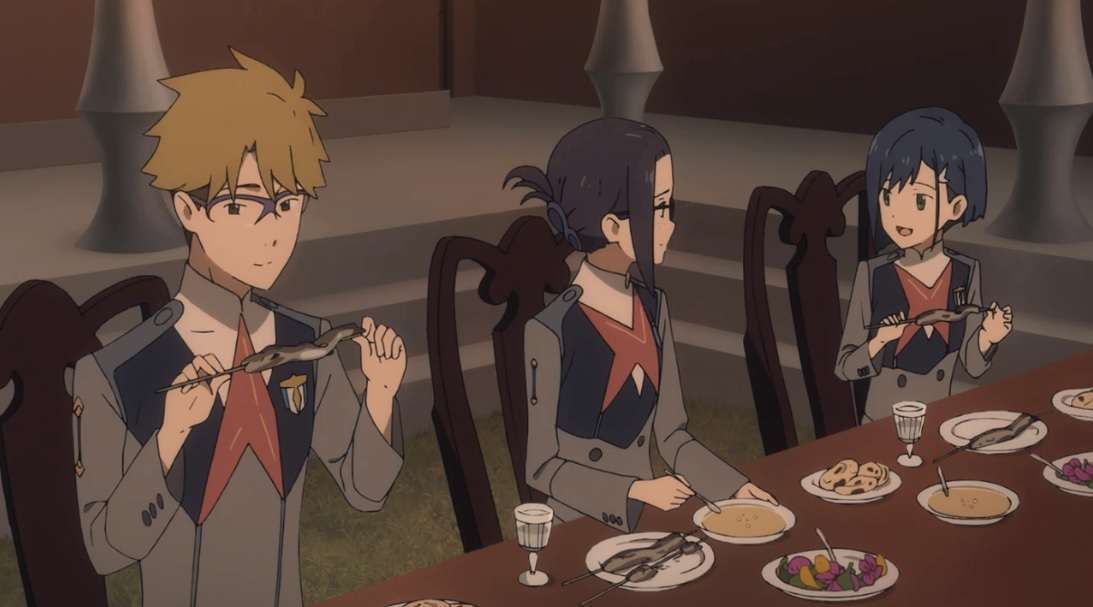 Interestingly, the FRANXX are absent in episodes 16 to 18, giving the pilots a brief moment when they can experience a life without fighting in the FRANXX. At a glance, the episodes appear to present an alternative condition where the pilots can experience a life without the mediation of technology that the aforementioned crises have converged in. They are even shown to prepare handmade dinner from materials they harvest themselves when the supply of pre-prepared food is cut off, as if to reinforce the “go back to nature” feel.
