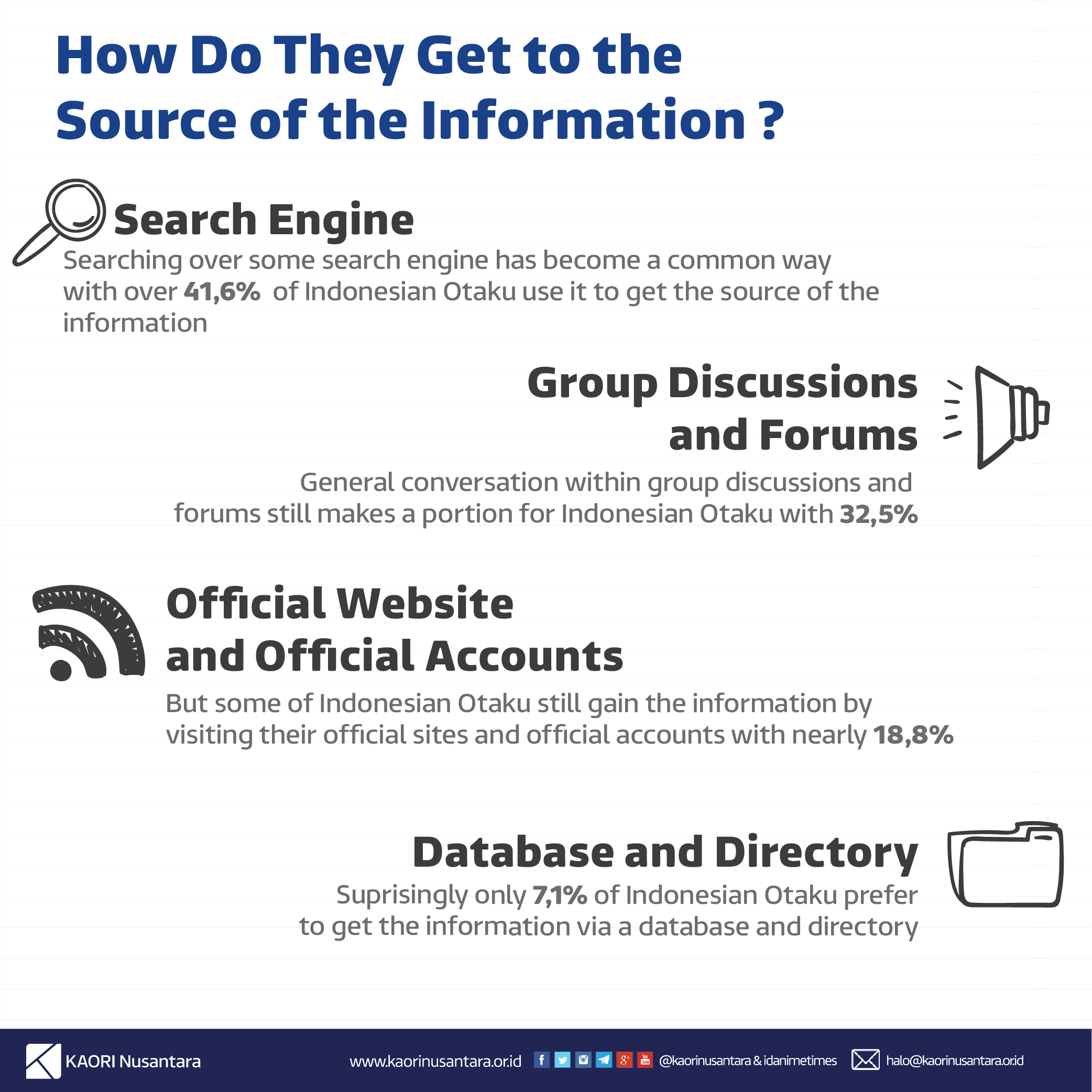 This brief profile shows that Indonesian otaku are confident in searching for information from group discussions and forums. They’d rather get information from human interaction through social media than human-machine interaction. Indonesian otaku can be considered to have passive information behavior because they get information more from forums and group discussions than the official account. But also because of their passive information behavior, their information searching behavior is purely out of curiosity and the information they get could affect their decision making. By getting informed from groups dan discussions, Indonesian otaku may provide open-mindnesess not only while searching various information with various tools, but also while discussing things with their community.