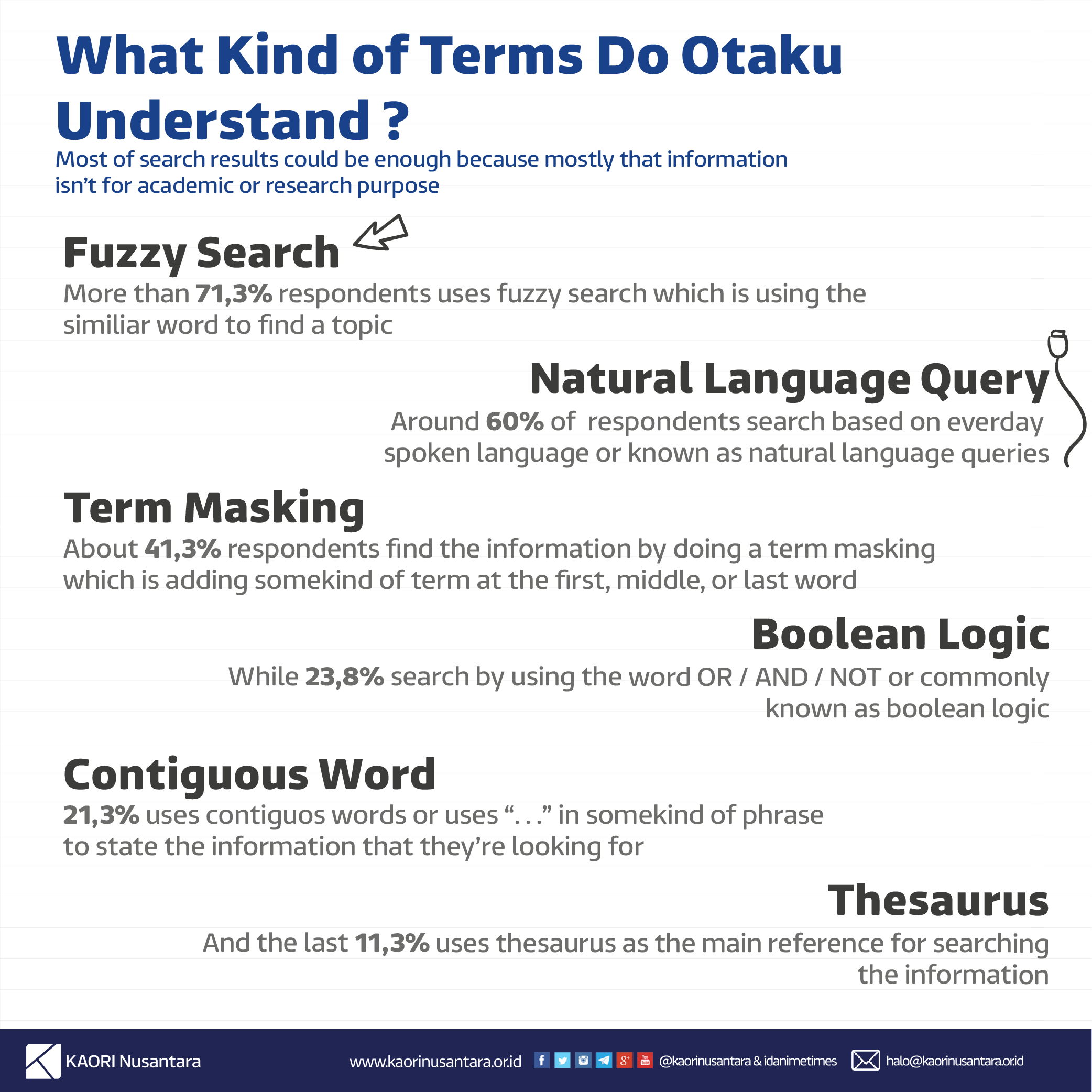 Indonesian otaku can determine whether search results are reliable or not and insert another query for more relevant information. We also asked them the probability of finding information in their natural language. So search engine results do not always show the information they needed, and they need further research about it.