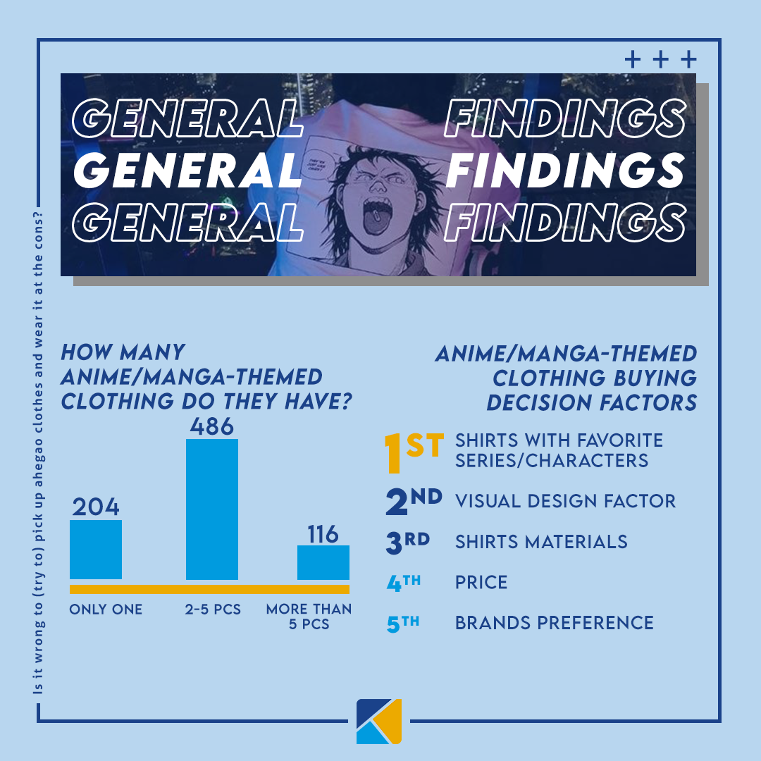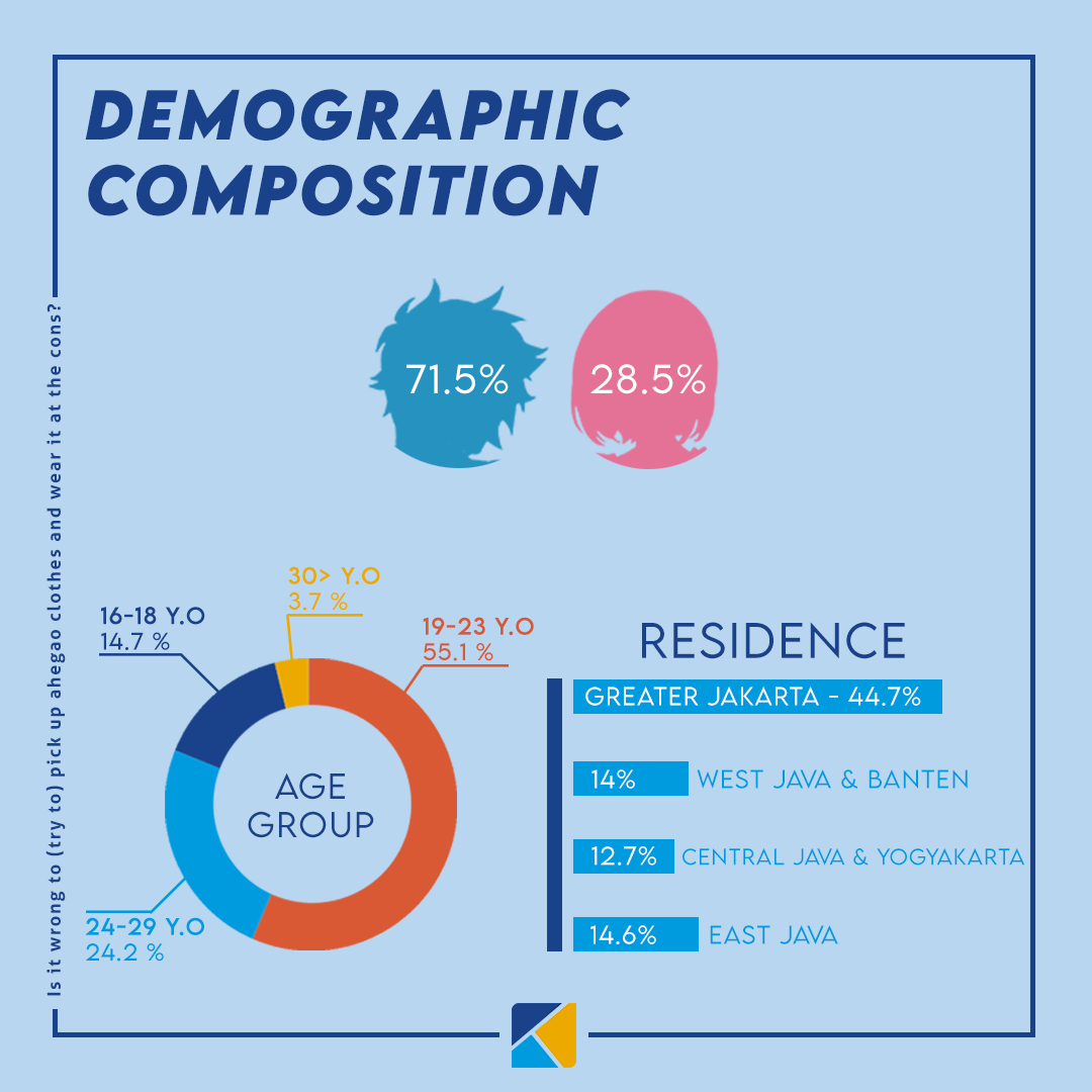 This survey also looks at the respondents’ opinions regarding the controversial use of clothing with pictures of ahegao, which could also be seen at Indonesian events/cons. Ahegao refers to exaggerated ecstatic facial expressions that characters in erotic manga and anime usually make during climax in sexual activities. Typical characteristics of ahegao are rolled eyes, flushed cheeks, and extended tongue, and as can be observed during direct data collection at events, the clothing usually shows the faces of female characters. The clothing has drawn considerable complaints that some anime conventions in the West has banned them. In this survey, we are looking for what our respondents in Indonesia think and feel about wearing the clothing or seeing other people wear the clothing, thus, the question of the clothing’s legality is outside of the scope of this survey. At the aforementioned events, our staff have also been able to directly get some event visitors who wear ahegao clothing to give their responses to this survey.