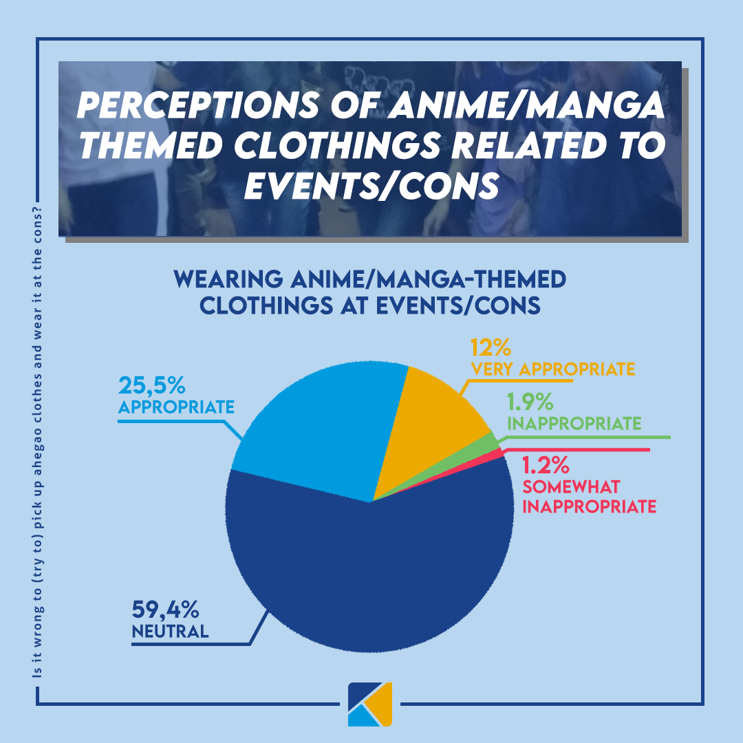 Those numbers tell how people who have anime-themed clothing use their clothing. But how do the appropriateness of the usage in various situations being perceived generally? Next we ask the whole respondents, first on how appropriate do they think wearing the clothing at events and cons is. The majority of respondents do not perceive it negatively, with 653 perceive it neutrally and 412 think it’s somewhat appropriate or very appropriate. Reasons cited in general say that because pop culture events or cons are places to enjoy interests and hobbies together with others, it is also fitting to express and show those interests to others including through clothing. The clothing might even help to identify others with similar interests.