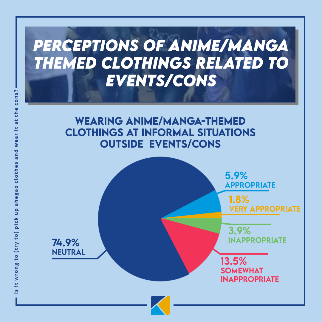 How about using the clothing outside of anime-related events? When it comes to using them in casual situations, there are more respondents who perceive it as somewhat inappropriate, but the majority with 824 respondents feel neutral about it. In general, wearing shirts with anime designs is seen as being no different from wearing shirts featuring any other designs or hobbies that the wearer like, so the right to wear them is to be respected. But perhaps not surprisingly, the majority of respondents perceive wearing anime shirt in formal situations to be somewhat inappropriate (395 respondents) or very inappropriate (531 respondents), due to T-shirt being generally considered less suitable for formal occasions unless the dress code allows them.
