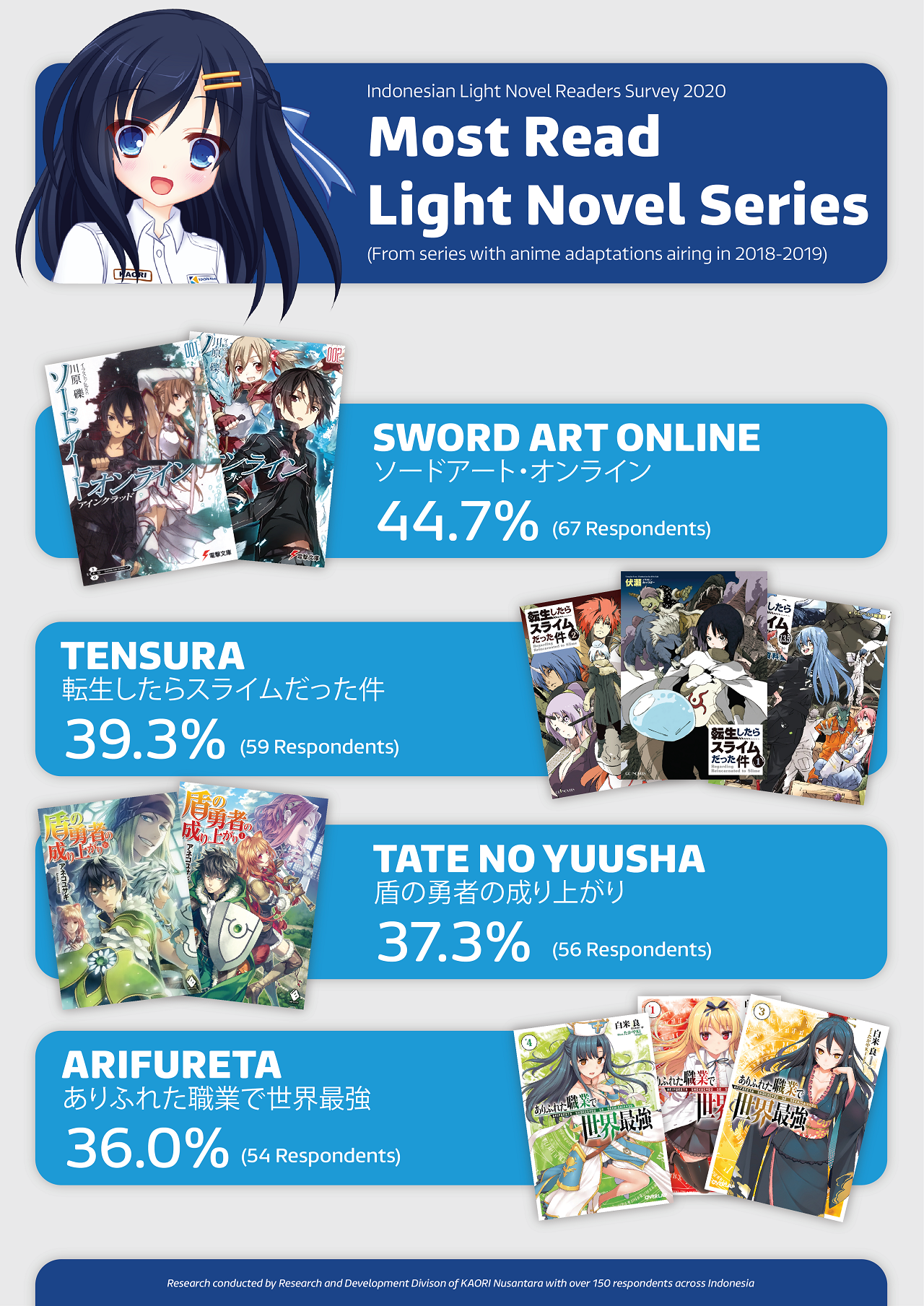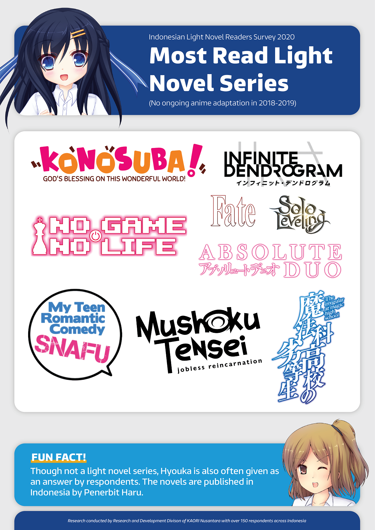 Considering those situations, KAORI sought to investigate how much interest anime fans in Indonesia have to read light novels. We conducted a brief survey on the subject conducted from 17 February 2020 to 27 February 2020 with a total of 150 participants. In addition to what titles they like to read, we also asked the respondents their means of reading and purchasing light novels.