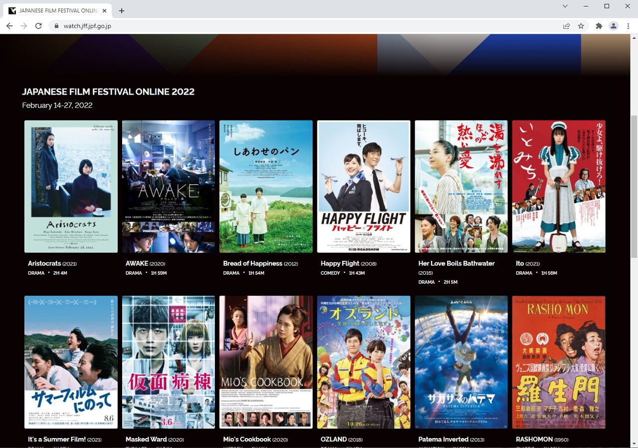- Open https://watch.jff.jpf.go.jp/. On the page, you will see a selection of the films that are available in your country.