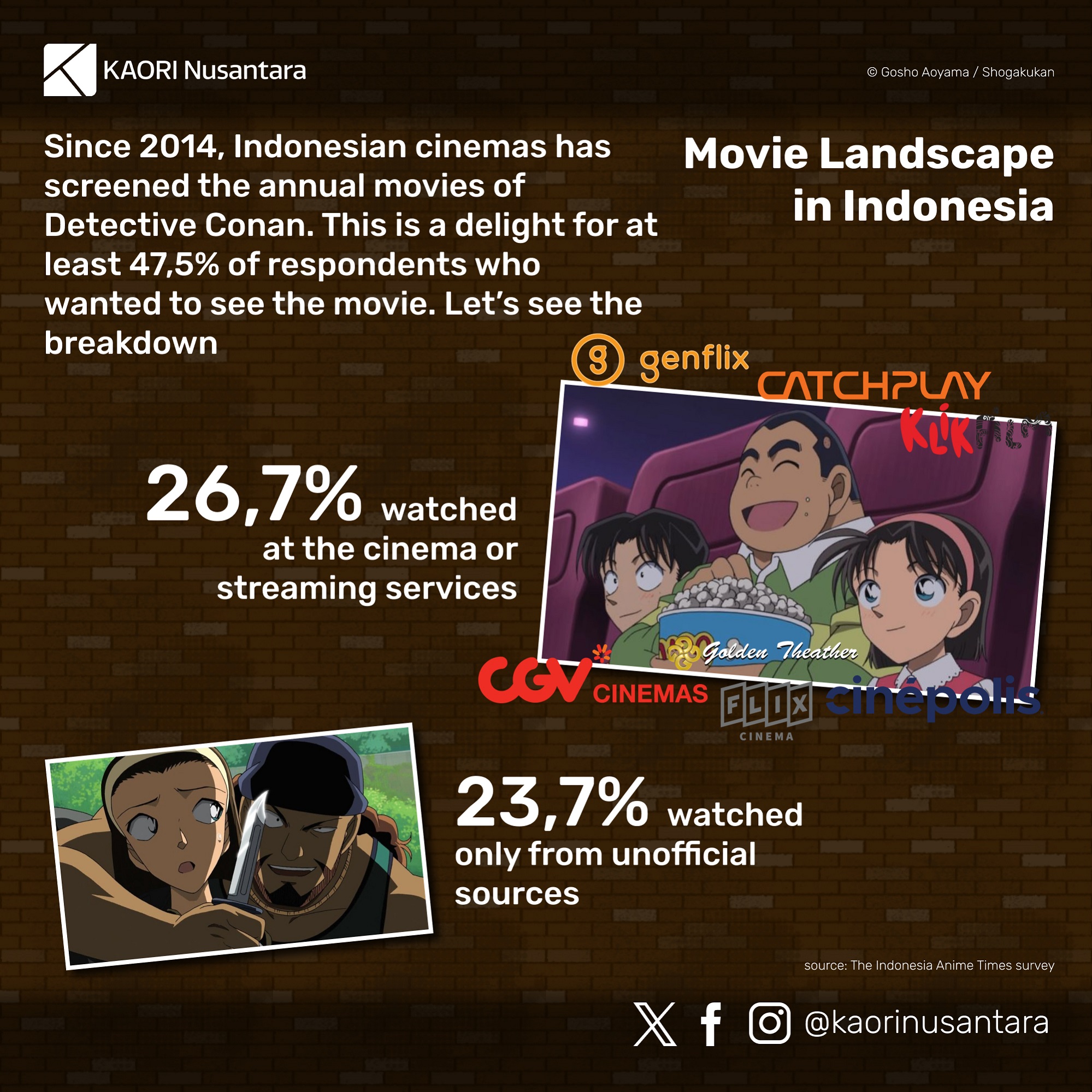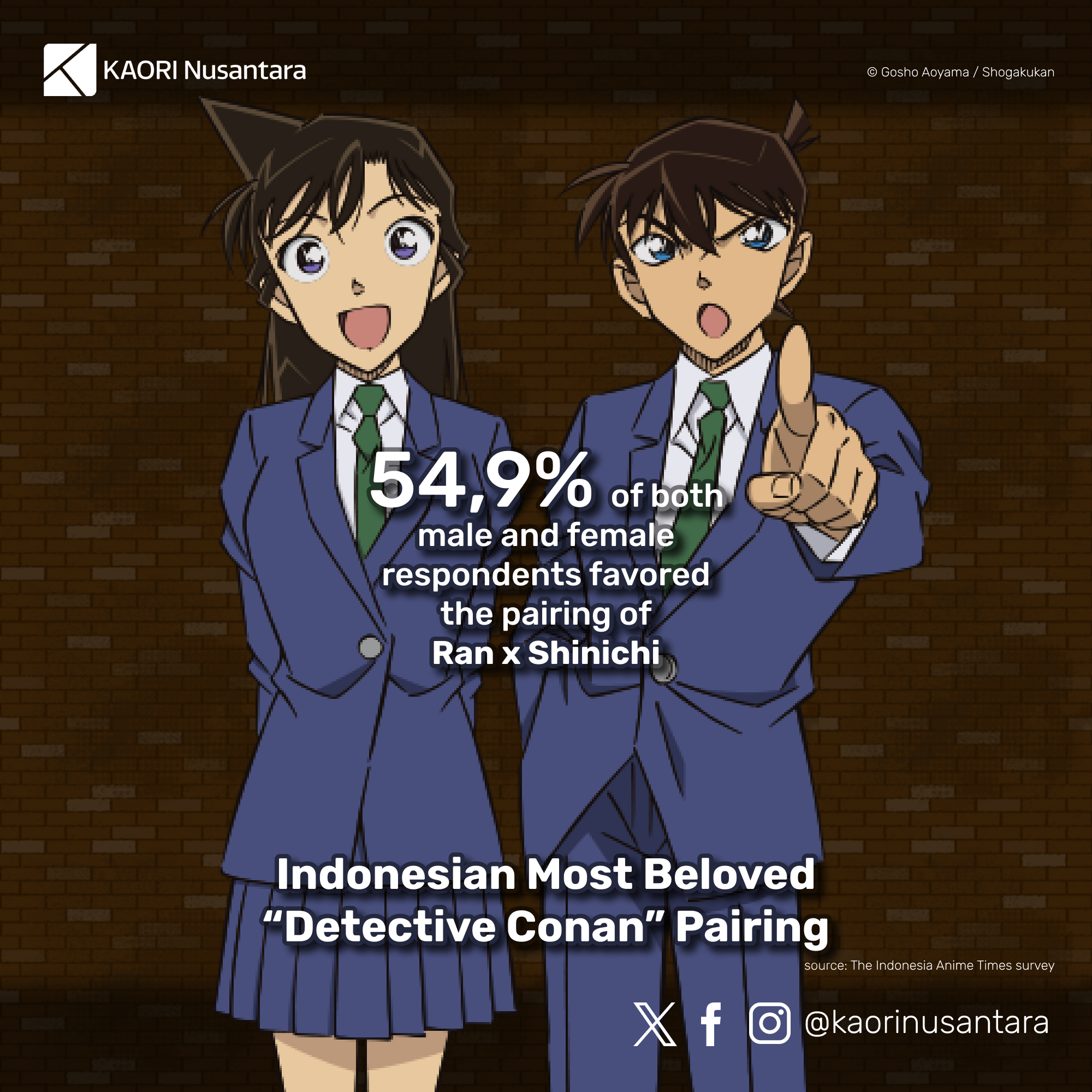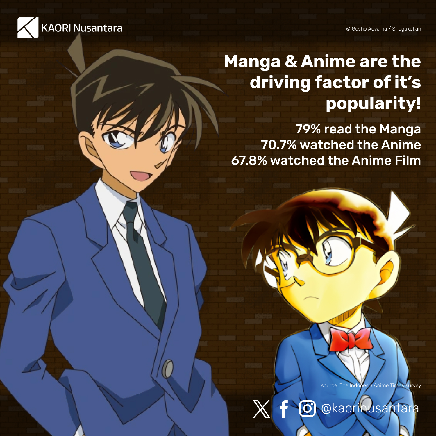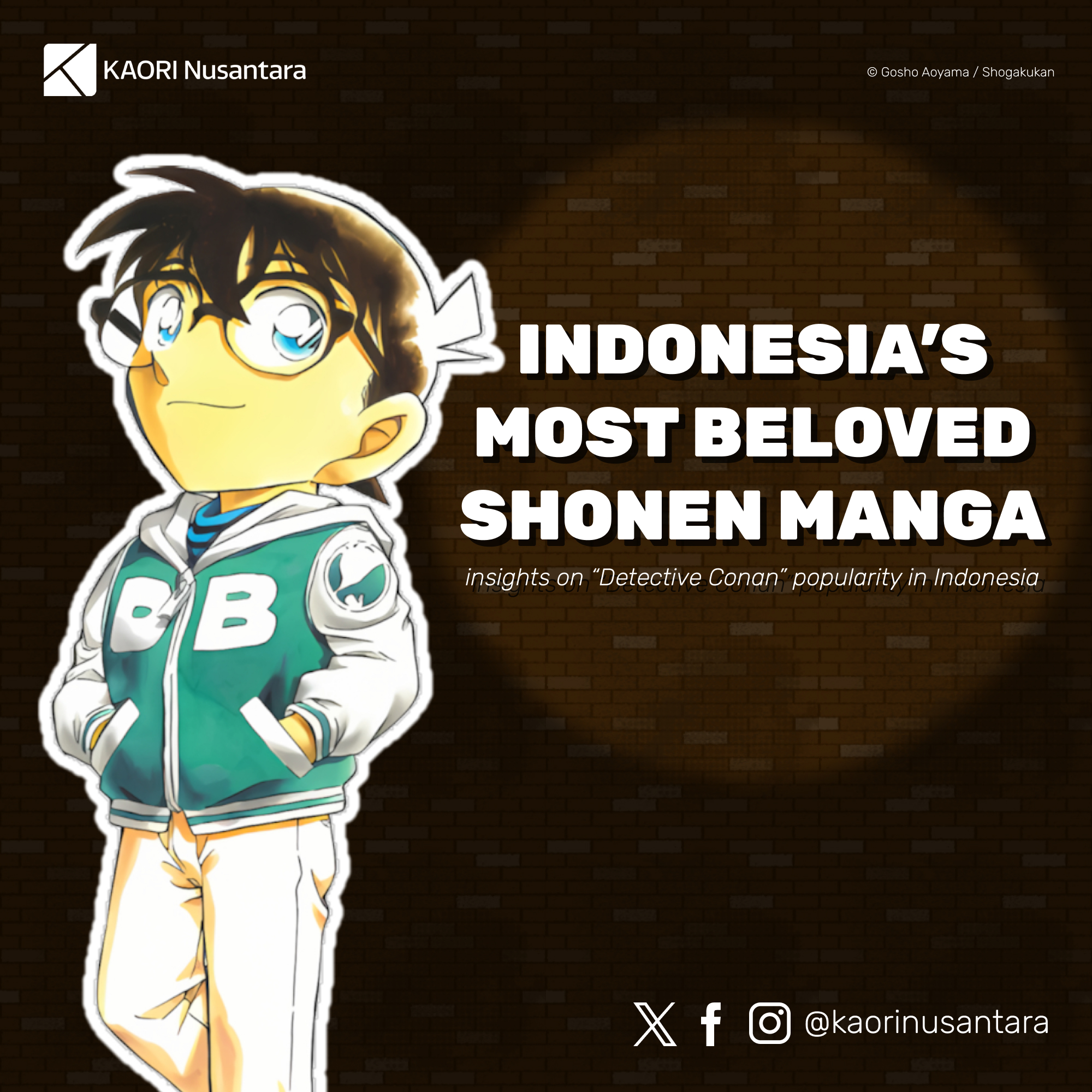 Created by Gosho Aoyama, Detective Conan has been the longest-running manga series of Weekly Shonen Sunday magazine after more than 30 years of serialisation, and an anime series based on the manga has also been in production continuously since 1996. In Indonesia, Detective Conan has been one of the biggest shonen manga titles. The official Indonesian edition of the series has been available before the so-called “big three” titles of Weekly Shonen Jump (One Piece, Naruto, Bleach) had official Indonesian editions, and its sales rival those three or have even surpassed them at times.