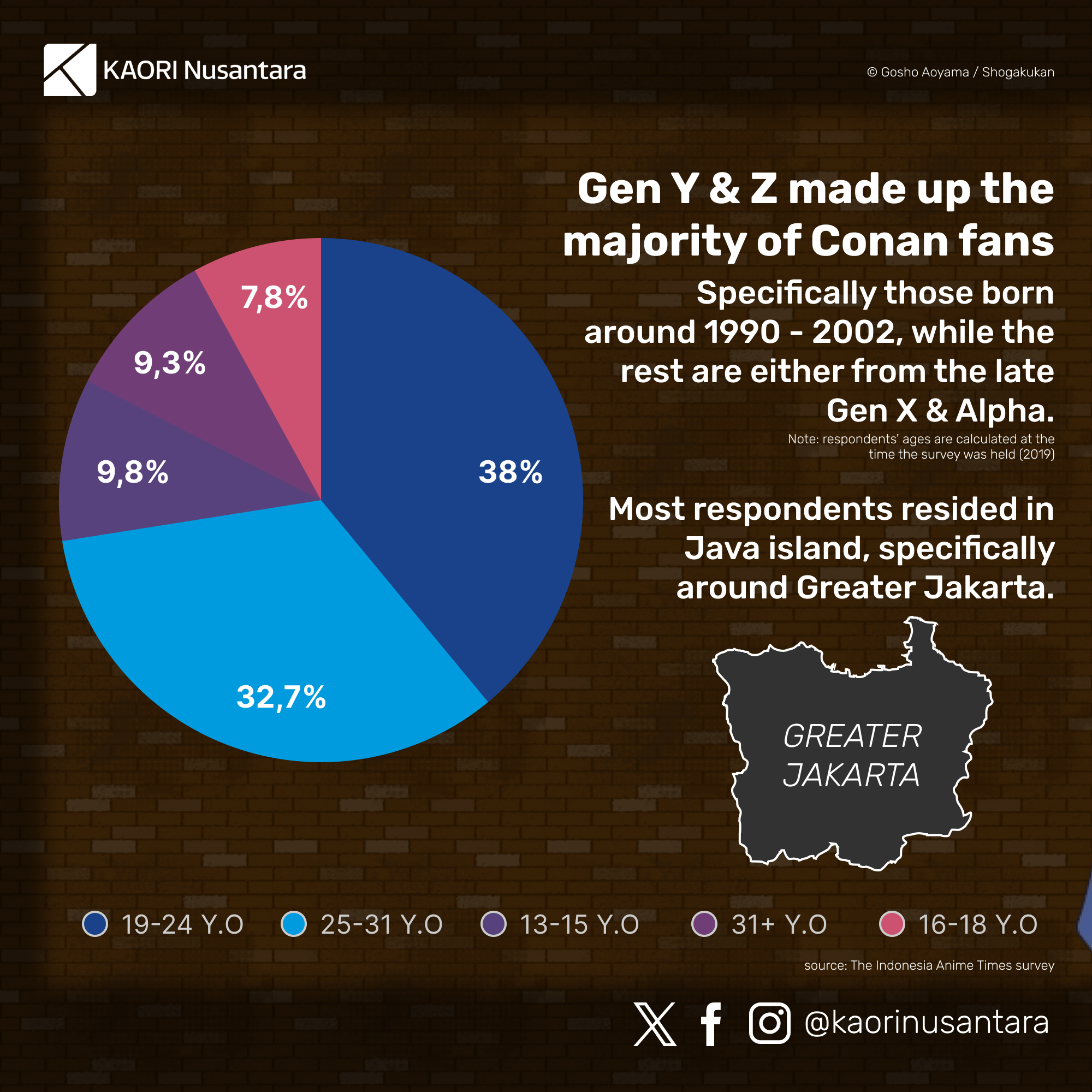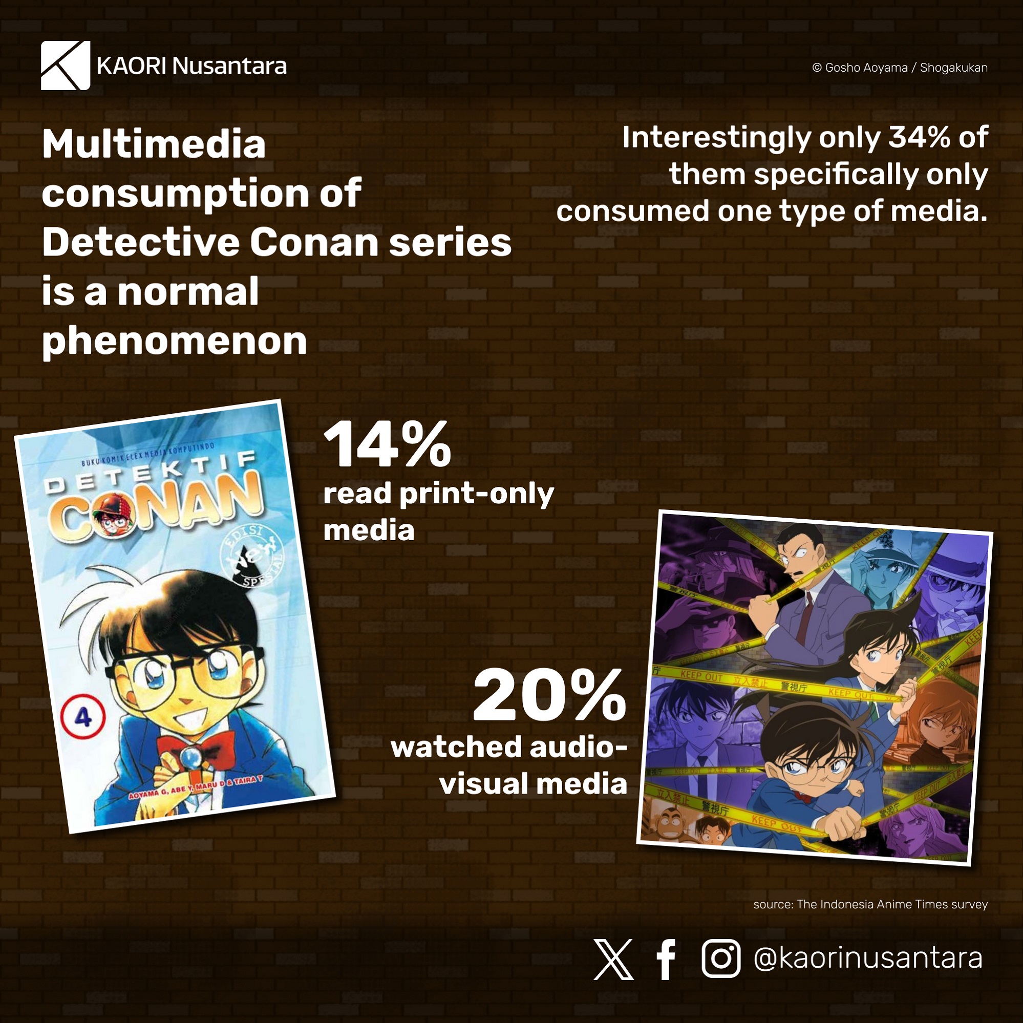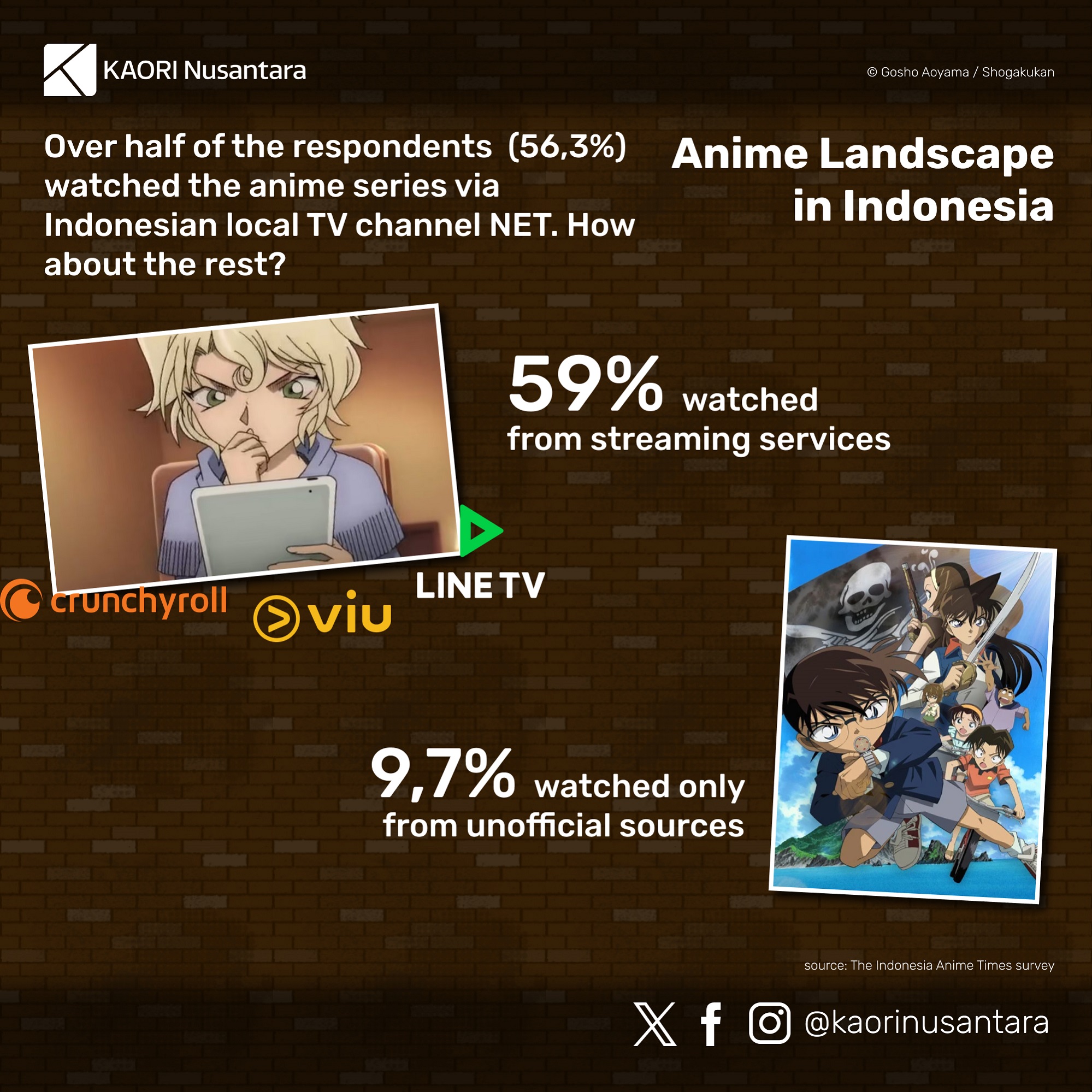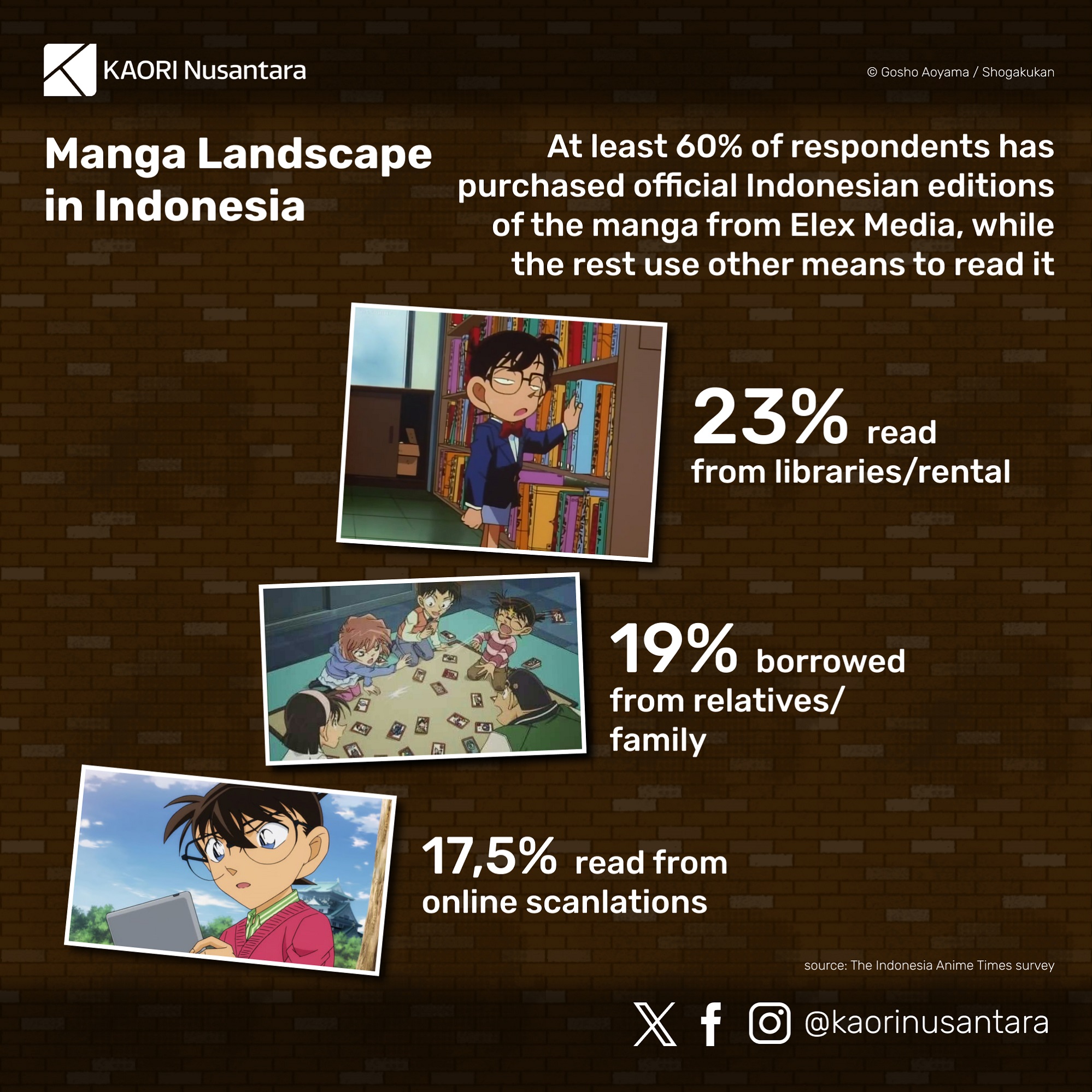 Given Detective Conan‘s history of popularity in Indonesia, to commemorate the release of the manga’s 100th volume in Japan and the broadcast of the anime’s 1000th episode in 2021, KAORI Nusantara made an effort to get a better picture of the series’ entry and reception in the country. There were two methods that KAORI employed to gather the data for this purpose. First, KAORI held an online survey for Indonesian fans regarding their consumption and reception of Detective Conan media. Second, KAORI invited the editor for Detective Conan from Elex Media, Binarti, and representatives from Conan Fans’ Club, Alfa and Panji, to discuss the series’ popularity in Indonesia in a podcast on 16 October 2021. Elex Media’s editors and the Conan Fans’ Club also cooperated to share the survey form.