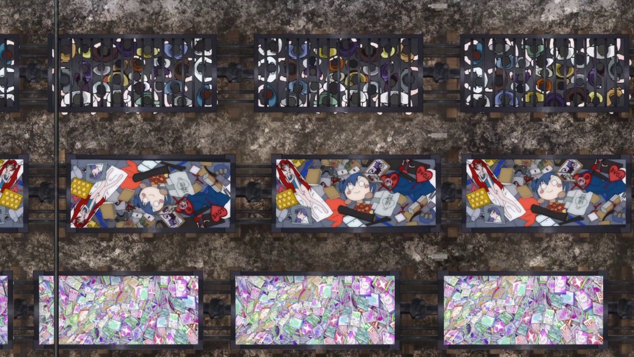 But Inagawa’s life history indicates that he was still in elementary school age in that period, which could mean what the anime presents regarding that time presumably comes from sources that aren’t his own personal experiences, like perhaps his older otaku informant who lives in Akiba or the other anime staff members. On the other hand, Inagawa’s “brand” is shaped by his experience of living some part of his youth in the USA, and encountering various subcultures from street culture to club music that influence his art, which could be seen to carry over into the anime’s design and musical aesthetics. While GARANNDOLL uses simple but effective familiar tropes to signify the contrast between the “otaku” protagonists and the Shinkoku military and the variations of the “otaku” interests, Magical Destroyers‘ aesthetics complicates the notion of “otaku” culture and invites us to question, what counts as a part of the culture and what can make it be considered as one? There aren’t easy answers to those questions, and that’s why it’s interesting to ask.