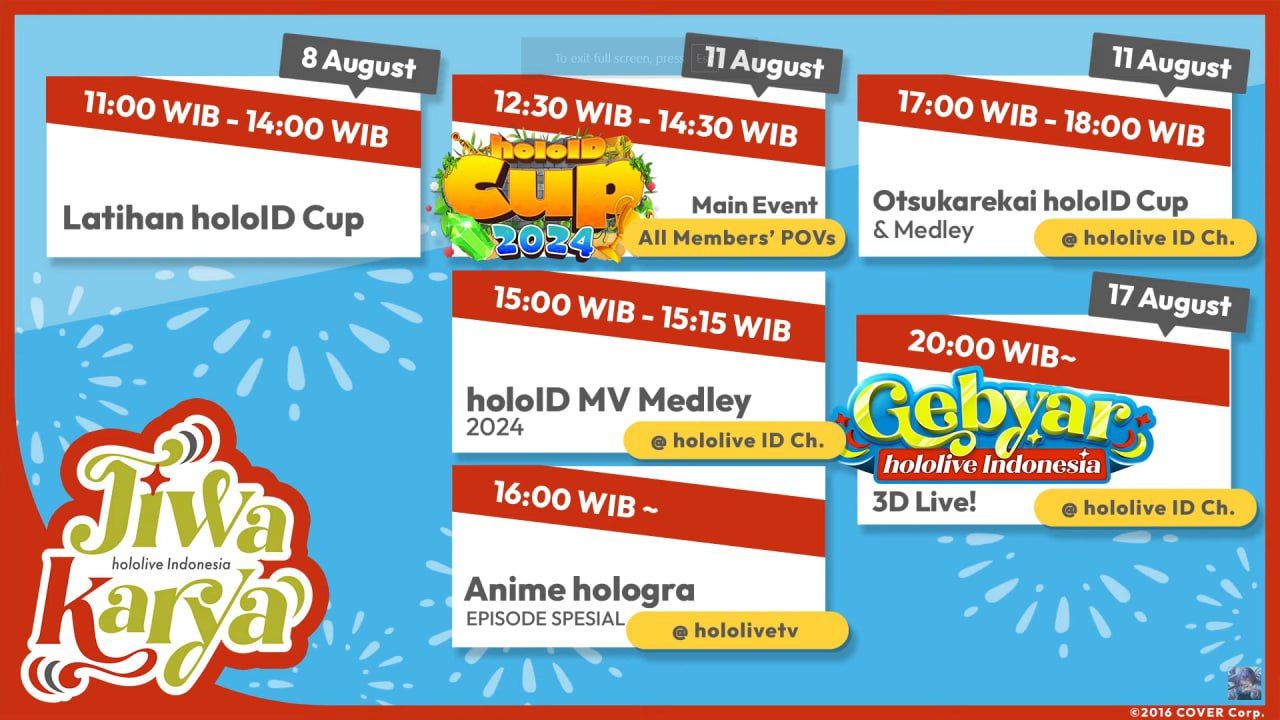 On Sunday (4/6), Hololive Indonesia announced their latest special event for August 2024. Held from 8 to 17 August 2024, the event’s theme is Jiwa Karya, a phrase from the Indonesian language that is literally translated as “The Soul of Work”. On social media, hololive Indonesian also uses the #holoIDJiwaKarya hashtag to refer to the event.