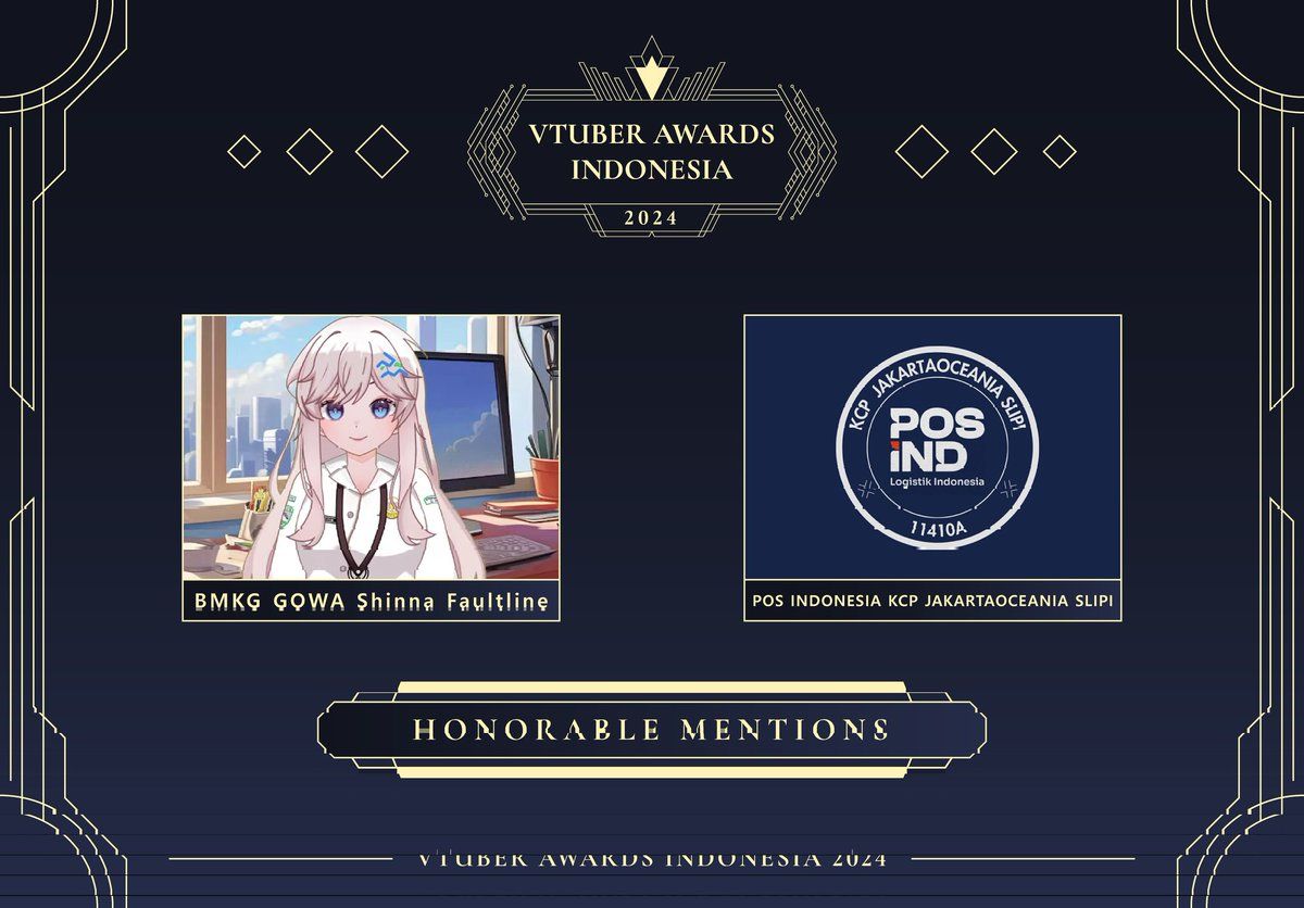 For the Honorable Mentions, the VTuber Awards Indonesia 2024 presented this to Shinna Faultline from BMKG Gowa and Pos Indonesia KCP Jakarta Oceania Slipi. These honourable mentions are given to the awardee for their support to the Indonesian VTuber community.