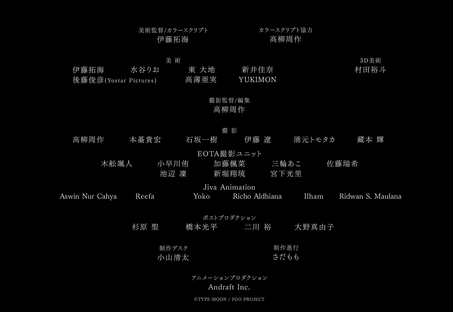 Interestingly, Indonesian animation studio Jiva Animation is also involved in the video production. At the end of the video, Jiva Animation and their animator are credited for the compositing (撮影/satsuei) department. The credited animators are Aswin Nur Cahya, Reefa, Yoko, Richo Aldhiana, Ilham, and Ridwan S. Maulana.