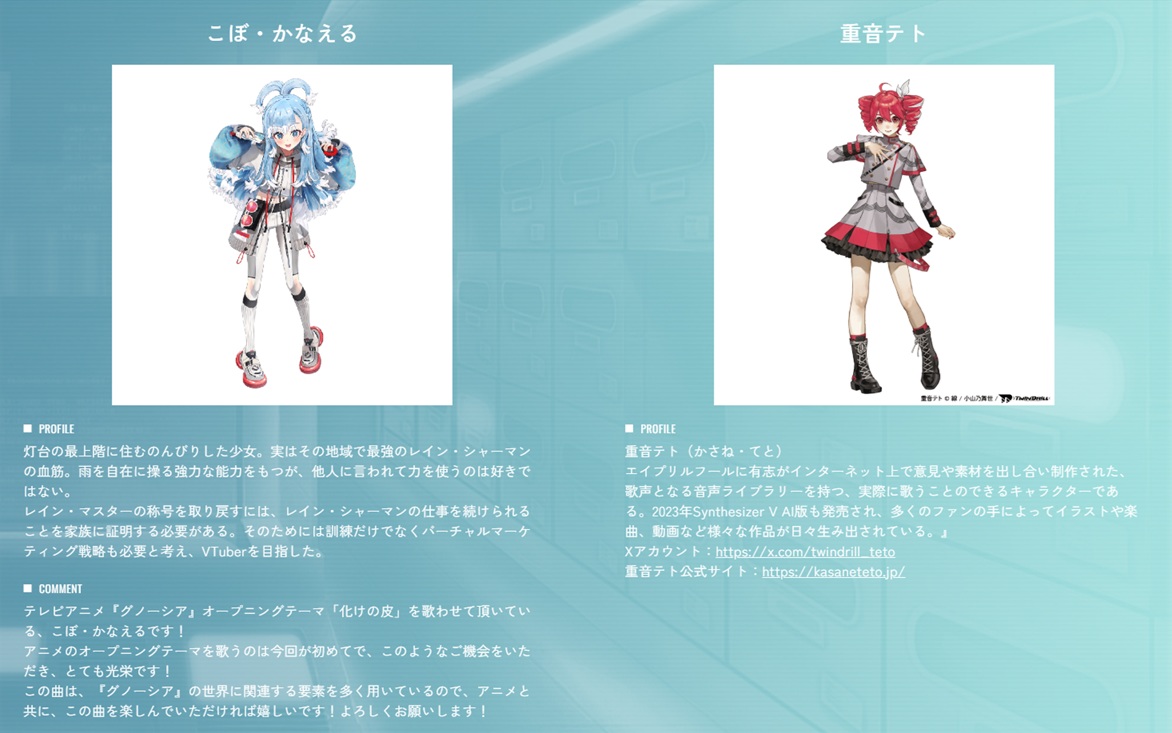The opening theme, Bakeno Kawa, will be performed by MAISONdes in collaboration with Kobo Kanaeru, virtual singer Kasane Teto, Giga, and TeddyLoid. The ending theme, Loo% Who%, will be performed by Ling Tosite Sigure.