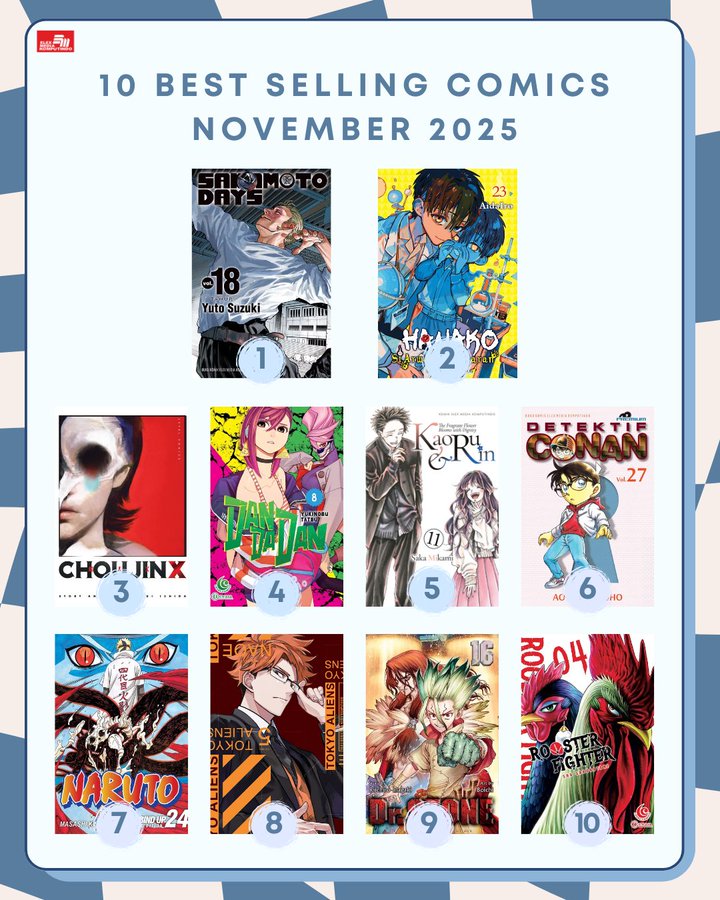 On Wednesday (10/12), the X (formerly Twitter) account of Elex Media’s comic editor posted a list of their best-selling comic books in November 2025. Sakamoto Days volume 18 took first place, followed by Hanako Si Arwah Penasaran volume 23 and Choujin X volume 1 in second and third place, respectively.