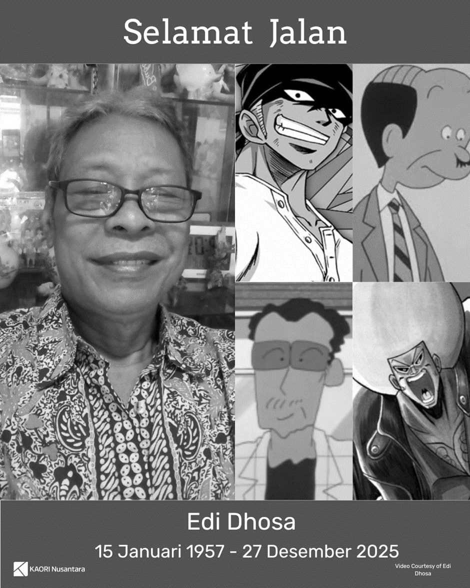 Indonesian voice actor Edi Setiono, better known as Edi Dhosa or Edhos, known for his roles on various anime such as One Piece, Crayon Shin-chan, and Kobo-chan, has passed away. This was confirmed by his fellow voice actor, Ferry Fadly. He passed away on Saturday, 27 December 2025, at 0835 Western Indonesian Time (WIT), and was laid to rest that afternoon.