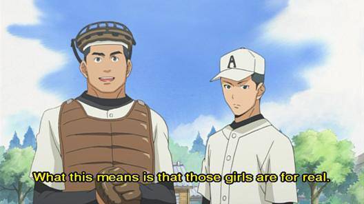 The above passage summarizes the spirit that drives this story, both in regards to the sports theme and to the issue of gender relations that it addresses. Regarding the sports theme, this show is one of the more realistic and down-to-earth kind. There are no physics-defying techniques, or over-the-top expressions. We just have some girls, learning and practicing baseball from nothing, covered in sweat and dust, and occasionally using some unusual methods. Ultimately, winning or losing does not matter too much. The more important things are all the efforts they had gone through to improve their skills, enjoying all those efforts, and enjoy the game.