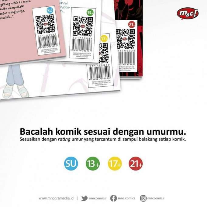 Through its Facebook account, Indonesian comics publisher m&c! has announced a new rating system for the comics they published. There are 4 categories based on the age of readers: SU (all ages), 13+ (ages 13 above), 17+ (ages 17 above), and 21+ (ages 21 above).