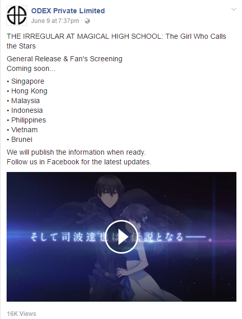 On Friday (9/6), ODEX Private Limited has announced via its Facebook page that the feature film of The Irregular at Magic High School (Mahouka Koukou no Rettousei) will be screened in several countries, including Indonesia. The exact release date of the film in Indonesia has yet to be revealed.