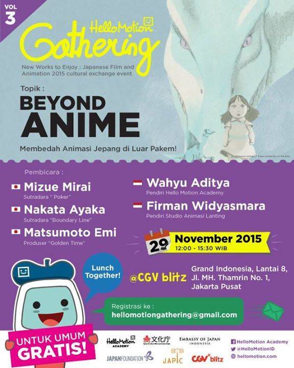 The Beyond Anime/HelloMotion Gathering Vol. 3 open discussion will be held on Sunday, November 29, 2015, at CGV Blitz Grand Indonesia between 13:00-15:30 WIB. Attendance is completely free, but guests will have to register from 12:00 WIB.
