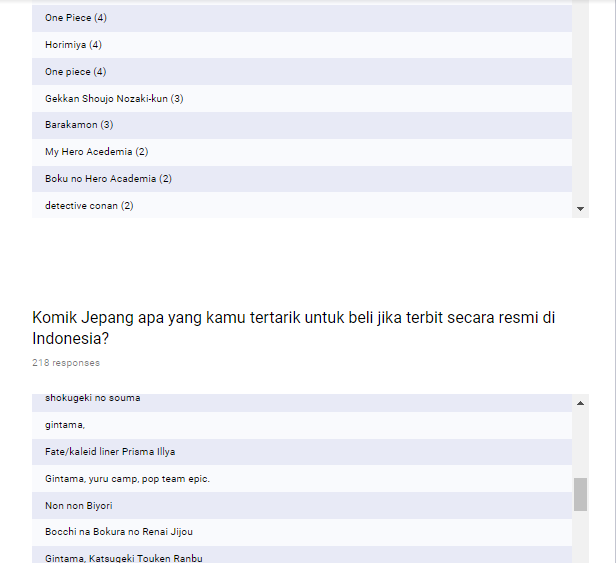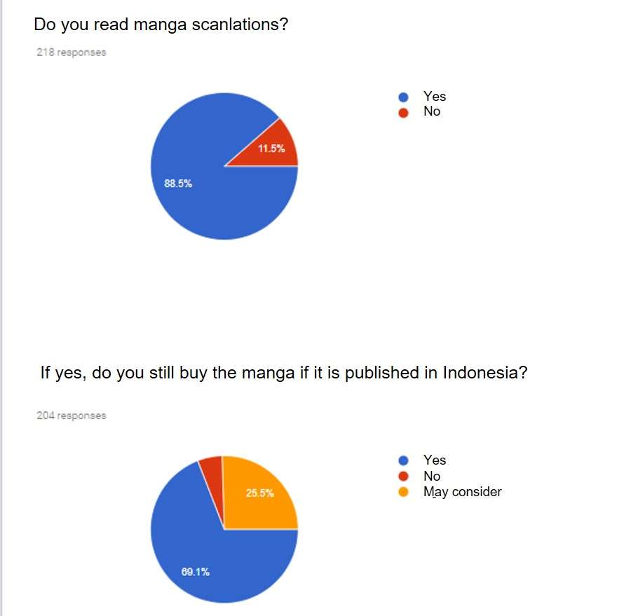 This survey only provides a picture of licensed manga in in Indonesia from the consumers’ perspective, particularly for physical manga. We will explore perspectives from publishers and information on digital manga at later times.