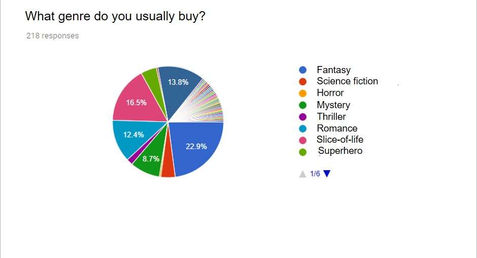 The respondents’ preferred genre mostly focus on fantasy, slice-of-life, romance, comedy, mystery, and action. Looking at the large proportion of respondents choosing fantasy, we can see that there is a high interest for comics with fighting scenes (which are usually featured heavily in fantasy stories like Fullmetal Alchemist). Also, from the popularity of slice-of-life, romance, and comedy, then we can also assume that love stories or even romantic comedies are preferred by the market at large. The market for superhero, sport, and sci-gi genres are niche market based on the survey.