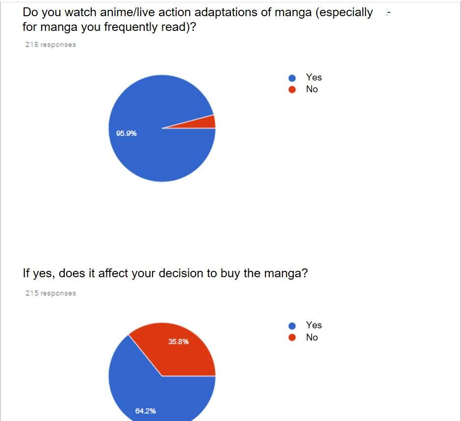 Almost all of the respondents (96%) said that they have also watched the anime adaptation of manga, especially the ones that they read regularly. From that number, 138 respondents said that watching the anime does affect their decision to buy the manga that has been published in Indonesia, while 77 respondents said that it does not affect their decision. When we consider the previous part, we can see the pattern where the airing and popularity of anime adaptation, and even other forms of adaptations, do give some extra boost to the purchase of the manga series. This situation can be seen with My Hero Academia, which has attracted general interest (appealing to both male and female readers and not limited by genre preferences). With Nozaki or Is the Order a Rabbit?, the effect also happens, but limited mainly to the targeted demographic of the respective manga.