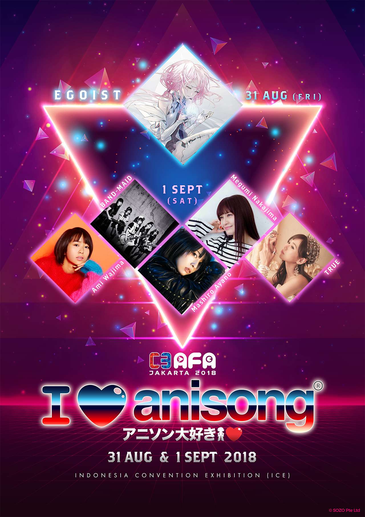 AMI WAJIMA, BAND-MAID, EGOIST, MASHIRO AYANO, MEGUMI NAKAJIMA & TRUE to perform at I LOVE ANISONG Stage C3AFA18 JAKARTA. This will be the first time for other five artists to perform in Indonesia, except EGOIST who was performing at AFA Festival in 2014.