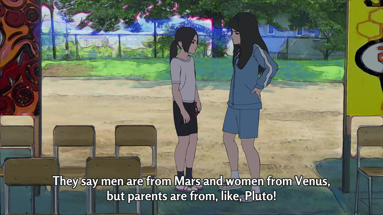 The rotoscoping technique also lets the director, Shunji Iwai, experimenting with his movie. As a director, Iwai is more familiar with live action. Rotoscoping allows him to do some experiment when recording in live action, then trace it to animation to make the movement more realistic. The slow motion parts, for example, looks like they were recorded with high speed camera before slowing it down in editing process.