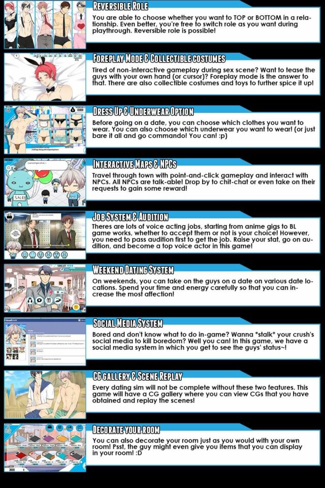 Tentu saja mengatur kehidupan sang tokoh utama bukan cuma soal karir dan kehidupan sehari-hari saja. Pemain juga bisa membawa sang tokoh utama untuk membina hubungan dengan salah satu dari lima rekan kerjanya, yang kesemuanya merupakan cowok-cowok kece nan tampan lagi menggairahkan. Selain itu akan ada dua karakter rahasia yang juga bisa didapatkan untuk “ditembak” menjadi kekasih. Rencananya, dalam versi full dari novel visual ini, pemain akan ditantang untuk mengatur kehidupan, termasuk asmara dari sang tokoh utama dalam tenggat waktu 1 tahun.