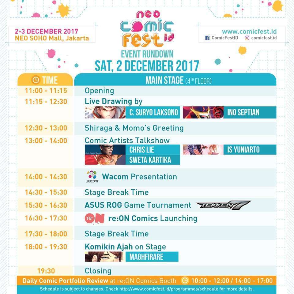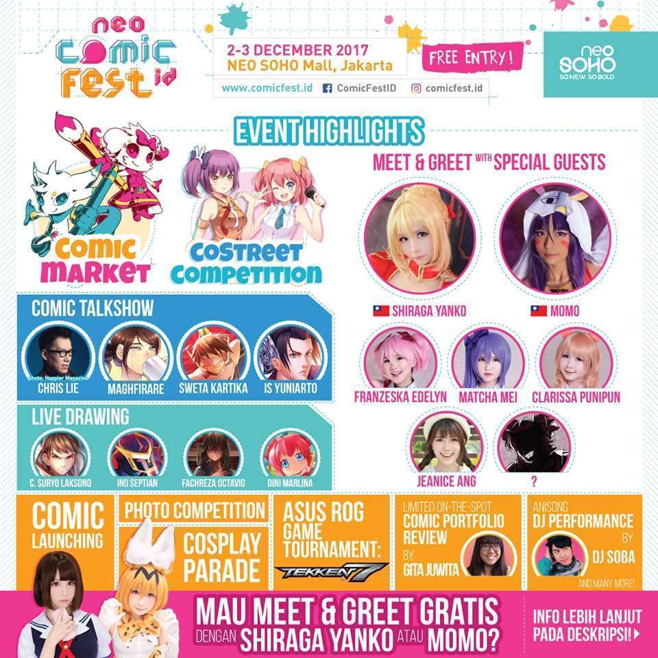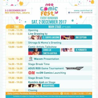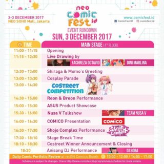 Diselenggarakan oleh re:ON Comics, acara ini akan digelar di NEO SOHO MALL, Jakarta, pada tanggal 2 – 3 Desember 2017 mendatang. Berbagai acara yang akan diselenggarakan di perhelatan ini di antaranya: