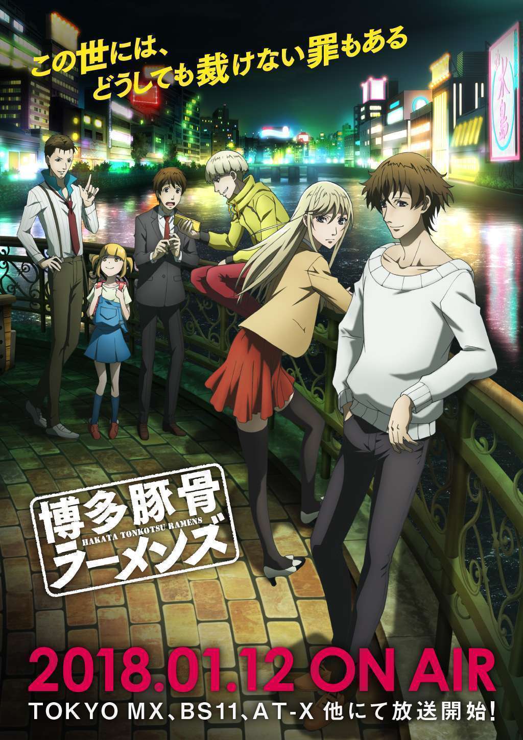 Sebagaimana telah diberitakan sebelumnya, Hakata Tonkotsu Ramens (Hakata Pork Bones Ramens), novel karya Chiaki Kisaki dengan ilustrasi oleh Hako Ichiiro ini akan diadaptasi menjadi anime. Anime ini akan dirilis di Jepang pada 12 Januari tahun 2018 mendatang, melalui saluran Tokyo MX, BS11, dan AT-X.