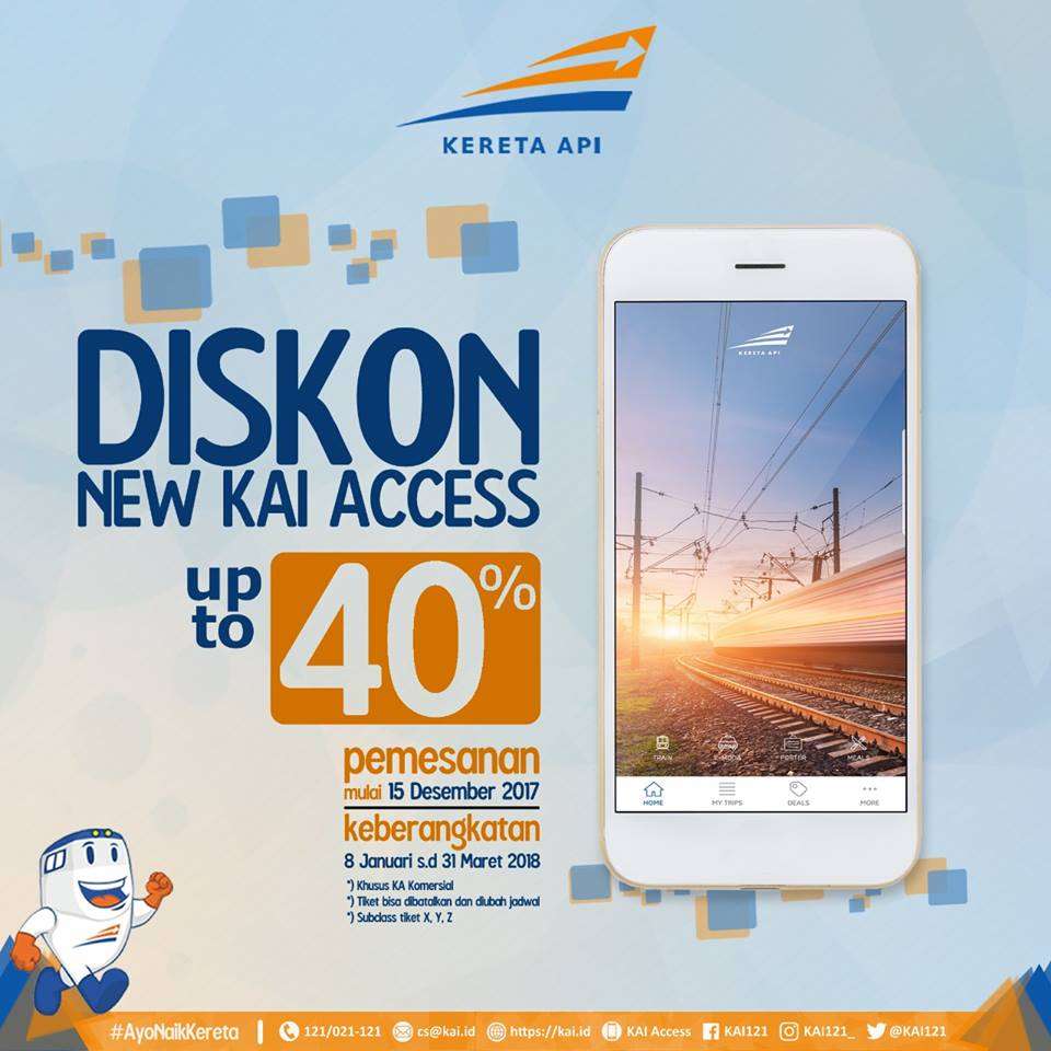 PT Kereta Api Indonesia (KAI) memberikan diskon pembelian tiket via aplikasi gawai, KAI Access. Diskon yang diberikan sebesar 40 persen. Potongan ini berlaku pada perjalanan kereta api (KA) komesial kelas eksekutif, bisnis dan ekonomi (non-PSO) di seluruh Jawa dan Sumatera. Diskon ini berlaku untuk KA keberangkatan mulai 8 Januari hingga 31 Maret 2018. Untuk tanggal pemesanan dapat dilakukan per 15 Desember 2017. Bagi calon penumpang yang berhalangan berangkat pada tanggal yang dipesan tidak perlu khawatir, sebab tiket tersebut dapat dibatalkan dan diubah jadwalnya.