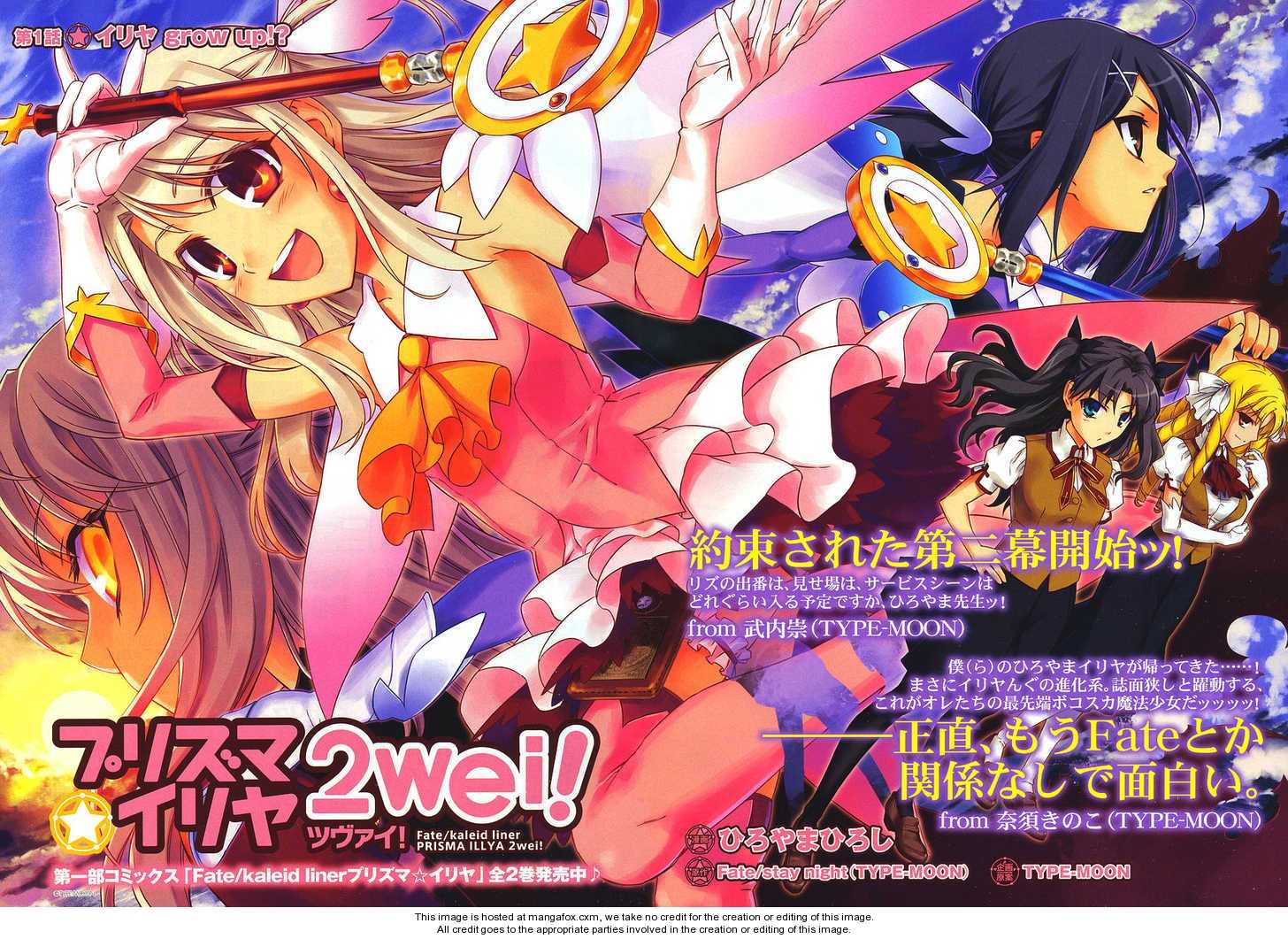 Seri ini diserialisasi oleh Hiroshi Hiroyama dalam bentuk manga dari tahun 2007 hingga 2008 dalam Comp Ace milik Kadokawa Shoten, dengan judul ‘Fate/kaleid Liner Prisma Ilya’. Kemudian, seri ini dilanjutkan dengan dua sekuel: ‘Fate/kaleid Liner Prisma Ilya Zwei!’ yang diserialisasi dari tahun 2009 hingga 2012 dan ‘Fate/kaleid Liner Prisma Ilya Drei!!’ yang diserialisasi dari tahun 2012 hingga sekarang. Adaptasi animenya sendiri sudah dilakukan musim panas tahun lalu, dan pada musim panas tahun ini, musim keduanya akan naik tayang. Diluar Jepang, seri ini dilisensi oleh Sentai Filmworks.