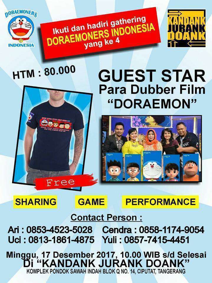 Pada 17 Desember 2017 lalu, DORAEMONERS INDONESIA, perkumpulan para pecinta Doraemon dari seluruh Indonesia berkumpul bersama dalam acara gathering atau kopi darat, alias berkumpul bersama. Bertempat di Kandank Jurank Doank milik selebriti ternama Dik Doank, ini adalah keempat kalinya DORAEMONERS INDONESIA menggelar acara gathering.
