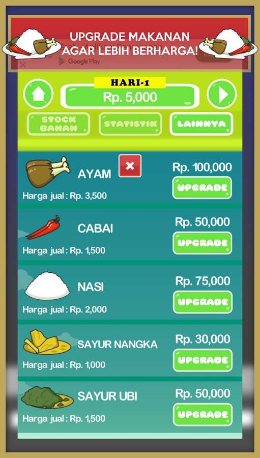 Di dalam game ini, pemain juga dapat mengupgrade setiap menu makanan agar pendapatan semakin meningkat. Dapatkan pula semua Achievement yang ada dan Pastikan nama pemain ada di Papan Peringkat sebagai Juragan Paling Kaya di antara Juragan Nasi Padang lainnya!