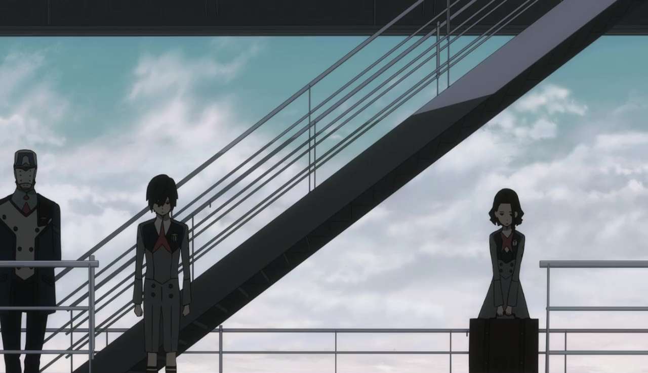 Namun hal tersebut hanyalah sebagian kecil dari episode perdana DARLING in the FRANXX. Selain menyampaikan ide dasar ceritanya, anime ini juga cukup efektif memberikan gambaran tentang dunia tempat para pilot tinggal. Melalui potongan-potongan dialog para pilot, penonton dapat mengetahui backstory mereka. Para pilot benar-benar hidup terpisah dari dunia luar dan kegagalan mereka menjadi pilot membuat mereka dianggap tidak lagi berguna. Tidak jelas nasib para pilot yang gagal tersebut, namun itu cukup membuat Hiro merasa ketakutan terhadap kondisinya.