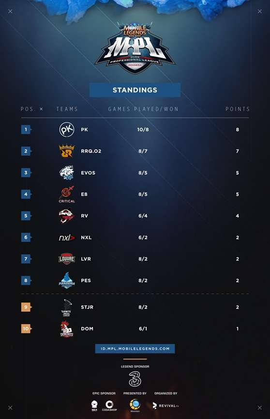 8 tim teratas di Regular Season MPL Season 1 ini juga nantinya akan diadu kembali di babak Playoff.
