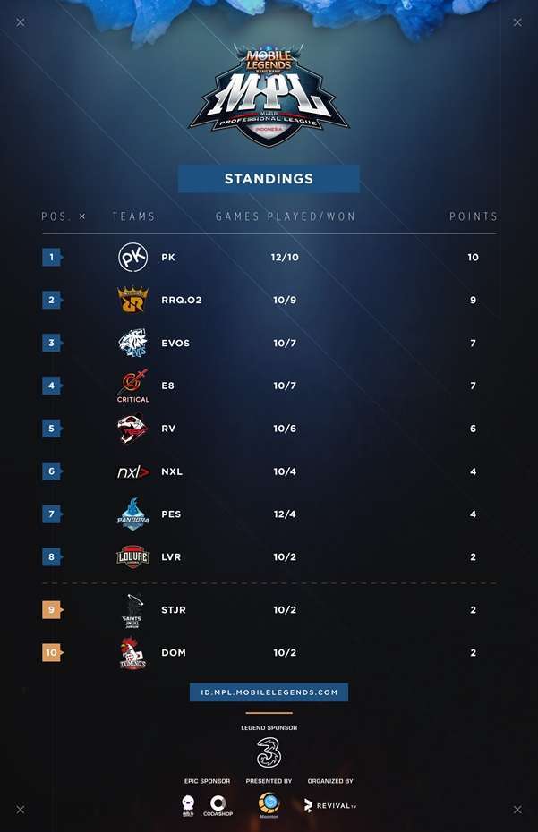 Mobile Legends: Bang Bang Professional League (MPL) Indonesia Season 1 sudah melewati separuh dari durasi liganya. MPL Indonesia sudah menyelesaikan pekan keempat dari 7 pekan yang dijadwalkan. Di minggu keempat ini, klasemen sementara masih belum bergerak untuk 4 tim teratas. Namun perubahan besar terjadi di zona degradasi (2 tim terbawah).