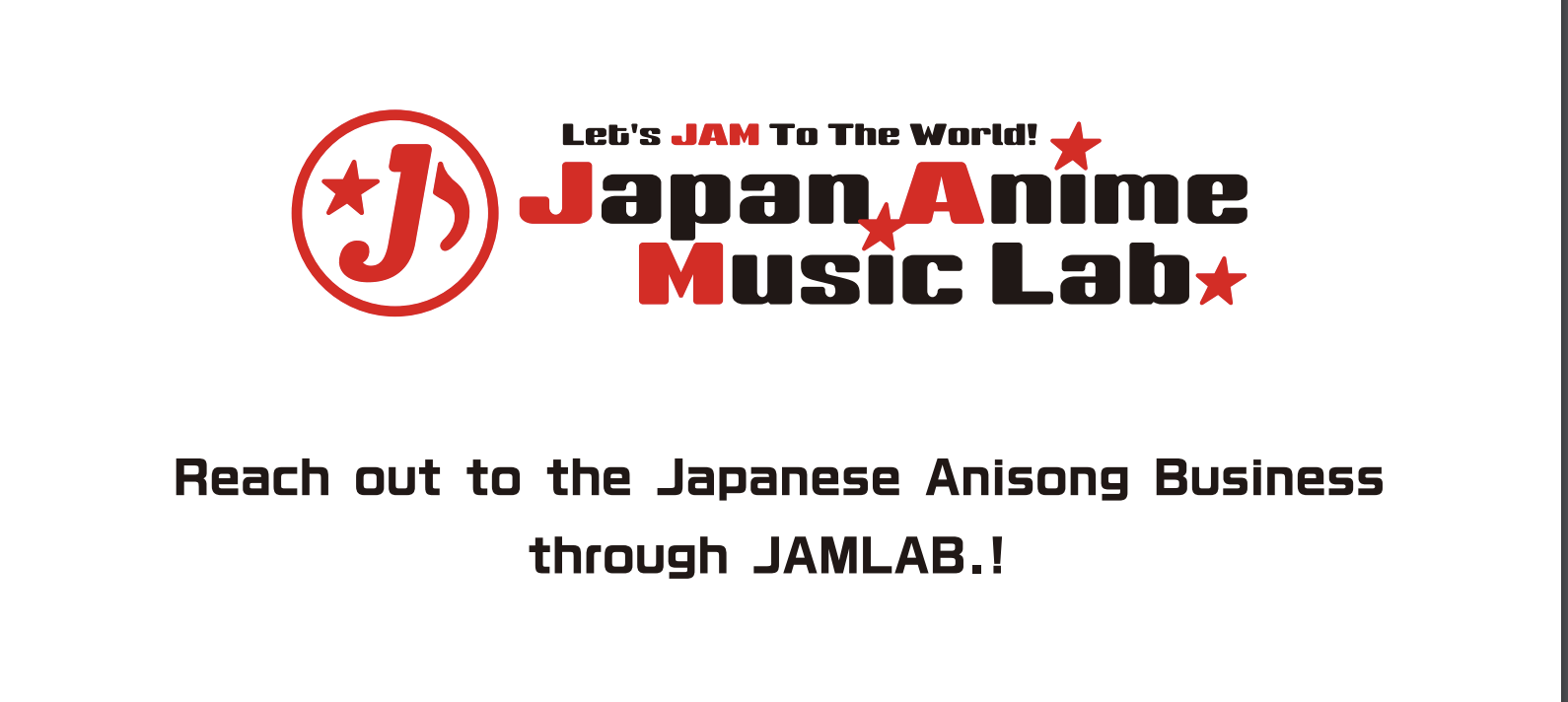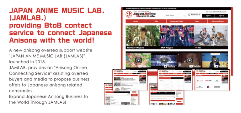 “Komunitas musik Jepang tahu bahwa banyak acara di luar negeri dan para profesional musik sering sulit terhubung dengan label rekaman, manajemen atau artist booking agent di luar negeri yang tepat akibat hambatan bahasa serta budaya sehingga sulit mencari informasi tentang artis dan kontak para profesional di bidang anisong,” kata Tak Furuichi, Direktur PROMIC. “The JAM LAB. dirancang untuk mengatasi masalah ini dengan mengunggah konten yang ditujukan untuk label rekaman internasional dan badan-badan licensing yang tertarik untuk mengeksploitasi musik dan konten lokal oleh artis Jepang, serta promotor konser dan acara serta berbagai media dan pers yang berhubungan dengan anime dan industri. ”