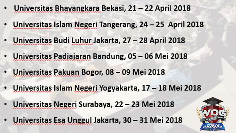 World of Gaming Goes to Campus, tahun ini akan hadir kembali di 8 kampus besar di Indonesia, antara lain kampus-kampus di kota Bandung, Surabaya, Yogyakarta, Tangerang, Bekasi, Bogor, dan Jakarta.