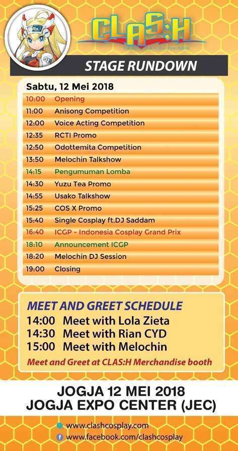 Di CLAS:H Yogyakarta kali ini juga akan dimeriahkan oleh Sokorahen Genki, komedian asal Jepang yang kini menetap di Indonesia dan mendalami dunia komedi di Indonesia, sebagai MC ditemani oleh Viviyona JKT48. Booth – booth yang menarik juga akan hadir memeriahkan acara CLAS:H Yogyakarta tahun ini.