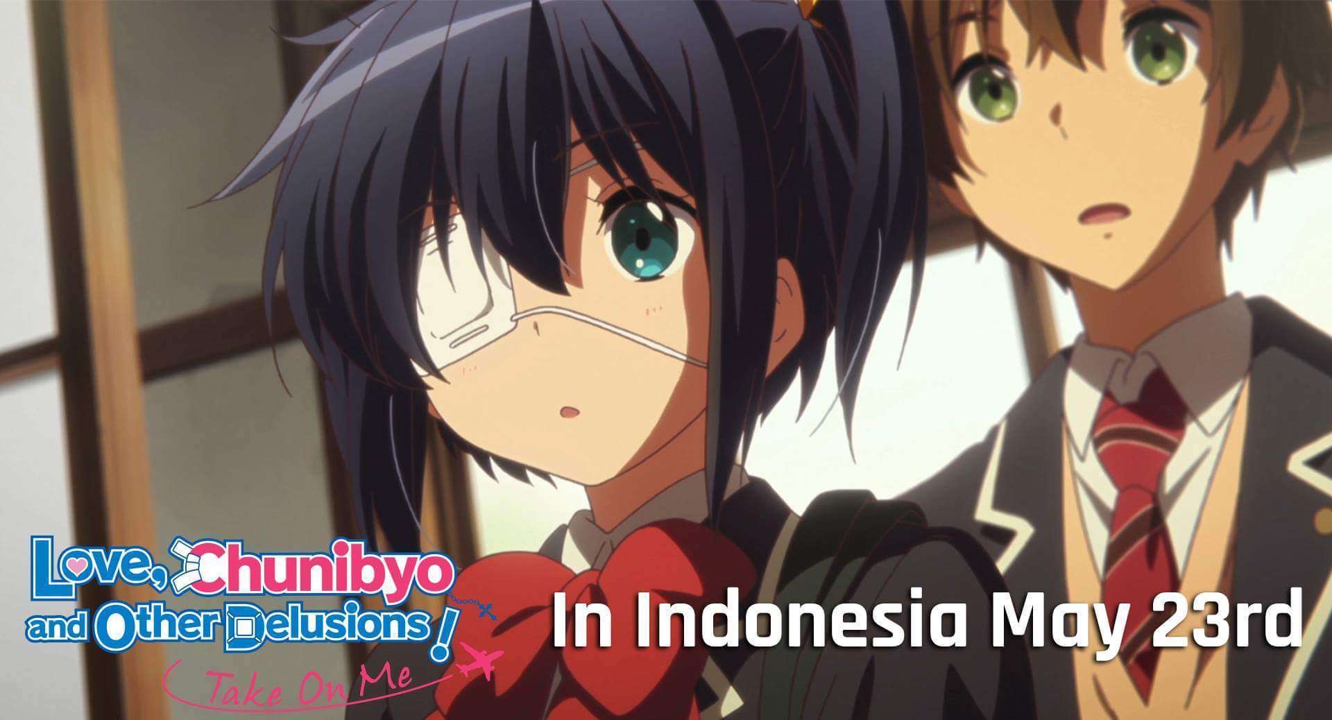 Diumumkan lewat laman Facebook distributor film Purple Plan, film anime Chunibyou demo Koi ga Shitai! – Take on Me – akan diputar di Indonesia pada tanggal 23 Mei 2018. Di tanah air, film ini akan dirilis dengan judul “Love, Chunibyo & Other Delusions – Take on Me -“.