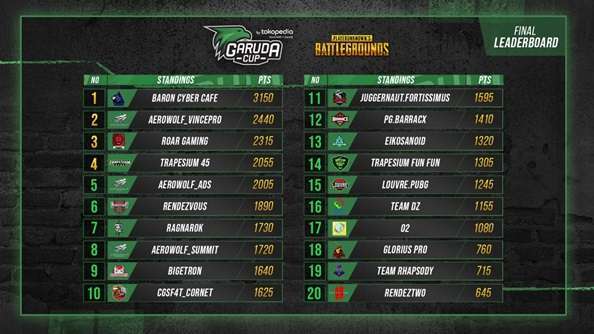 10 tim teratas kompetisi PUBG Garuda Cup by Tokopedia Voucher Game yang membawa pulang total hadiah Rp38 juta rupiah adalah sebagai berikut: