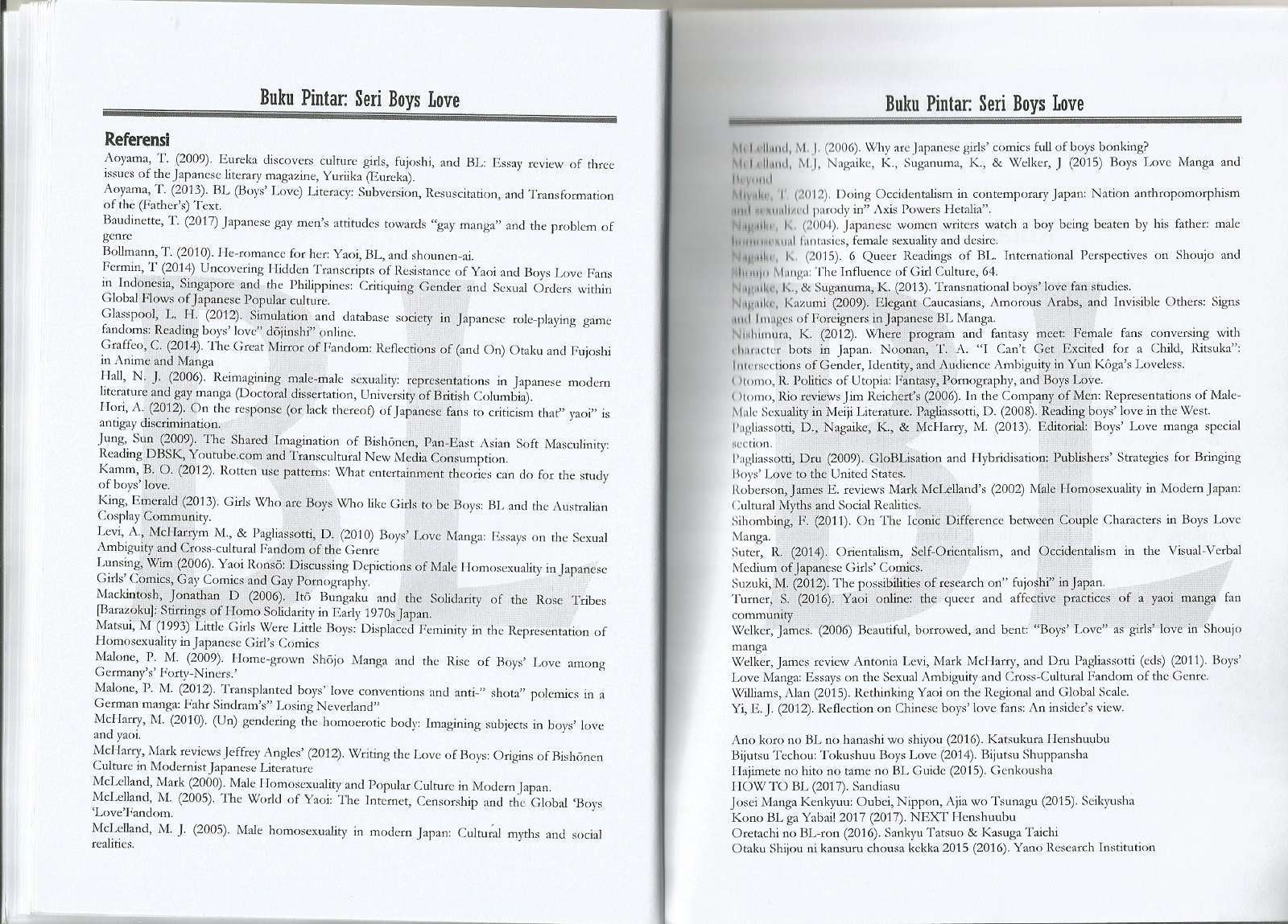 Di tengah-tengah daftar pustaka yang cukup mendetail tersebut, penulis mungkin bisa mempertimbangkan untuk turut menambahkan referensi yang cukup terkini mengenai BL, seperti video “A gay man’s opinion about yaoi/BL” (2018) dari vloger feminis LGBT, Masaki C Matsumoto, untuk menambahkan lebih banyak pandangan dari kaum gay terhadap BL. Atau bagaimana kaum fujoshi di komunitas tertentu yang harus menghadapi konflik antara identitas agamanya dengan identitasnya sebagai pecinta BL, sebagaimana bisa ditemukan dalam karya Jessica Bauwens-Sugimoto (2016) atau Ni Nyoman Wira (2014), yang cukup relevan dengan posisi Indonesia di tengah-tengah fenomena “globalisasi” BL. Tentu itu kalau penulis tertarik untuk “mengupdate” bukletnya di kemudian hari.