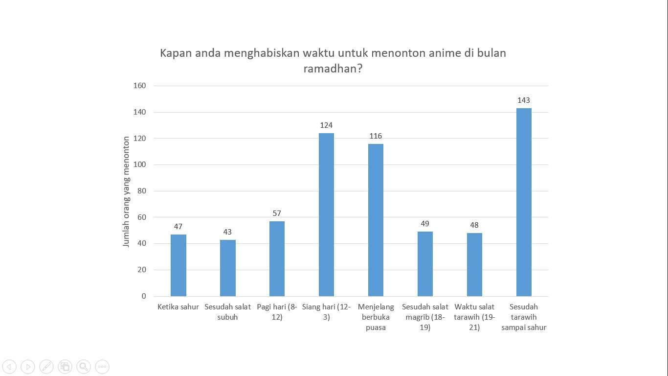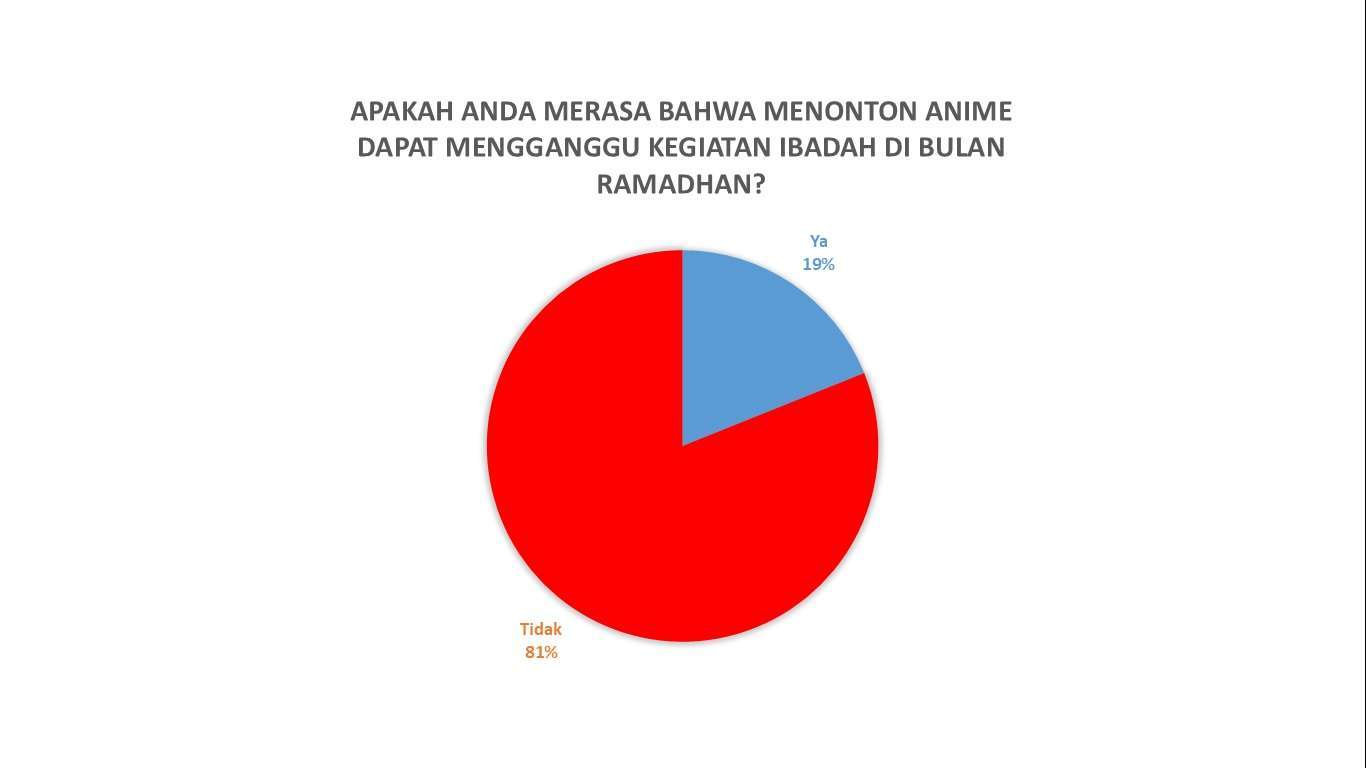 Sebanyak 296 responden atau 93% mengatakan bahwa mereka tetap menonton anime selama Bulan Ramadan. Hanya 23 responden atau 7% yang mengatakan bahwa mereka berpuasa menonton anime selama Bulan Ramadan. Ini menunjukkan sebuah penglihatan awal bahwa Ramadan tidak begitu memengaruhi kegiatan hiburan.