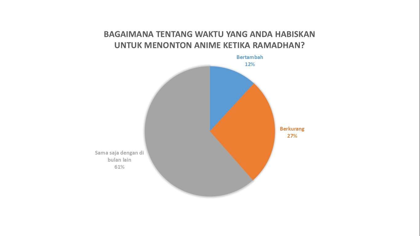 Sekarang mari kita lihat bagaimana responden berpikir mengenai perubahan kebiasaan menonton di Bulan Ramadan. Di luar dugaan, sebagian besar responden yaitu sebanyak 61% mengaku bahwa tidak ada perubahan lamanya waktu menonton anime ketika Bulan Ramadan dibandingkan dengan di bulan lainnya. Sebanyak 27% responden mengaku waktu mereka berkurang, sementara sisanya yang mengaku waktu menonton mereka bertambah menjadi minoritas.