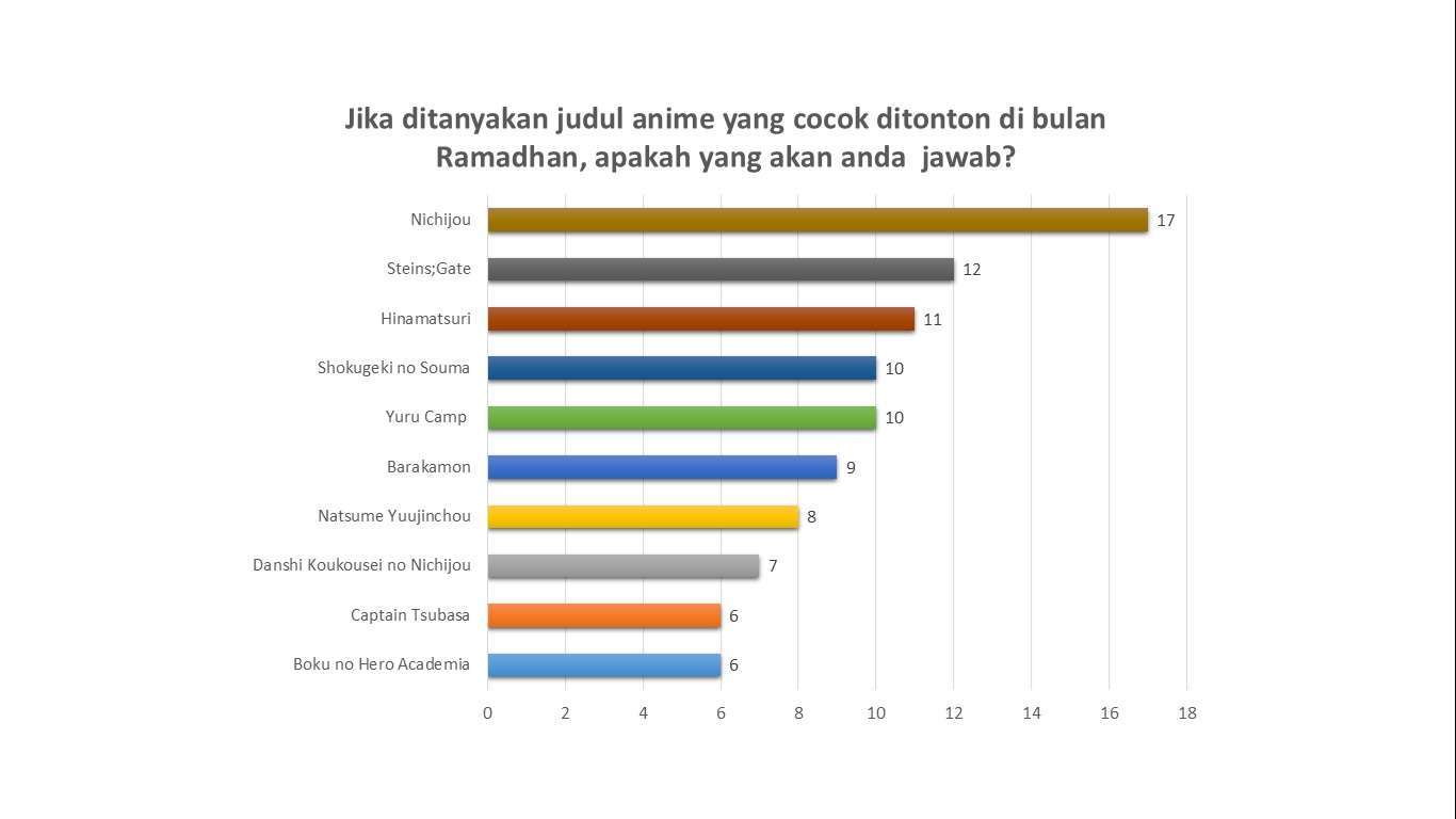 Sekarang kita tahu bahwa cukup banyak orang yang mau menonton anime di Bulan Ramadan. Pertanyaan berikutnya adalah: apa yang mau ditonton? Kami mencoba menanyakan anime yang cocok untuk ditonton di Bulan Ramadan ke responden dan hasil yang diperoleh bisa dikatakan cukup di luar dugaan.