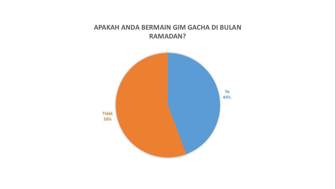 Selain menonton anime, kami juga menanyakan mengenai kegiatan bermain gim gacha. Bagi mereka yang belum puas dengan menonton anime, biasanya permainan mengundi nasib untuk mendapatkan karakter favorit ini bisa menjadi alternatif hiburan. Jika anda belum tahu apa itu gacha, mungkin bisa mempelajarinya dahulu di sini. Dari grafik berikut ini, dapat kita lihat bahwa dari semua responden, rupanya hanya 44% yang mengatakan bahwa mereka juga bermain gacha di Bulan Ramadan.